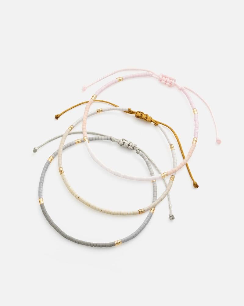 هذه الأساور تعكس جوهر البساطة والأناقة الطبيعية، حيث تنساب خيوطها الناعمة بتناغم مع حبات دقيقة تعكس لمسات من الإشراق الهادئ. بألوانها الراقية وتصميمها الخفيف، تمنح لمسة من الجمال العفوي، مما يجعلها مثالية للإطلالات اليومية أو لإضفاء لمسة أنثوية راقية على أي مناسبة.