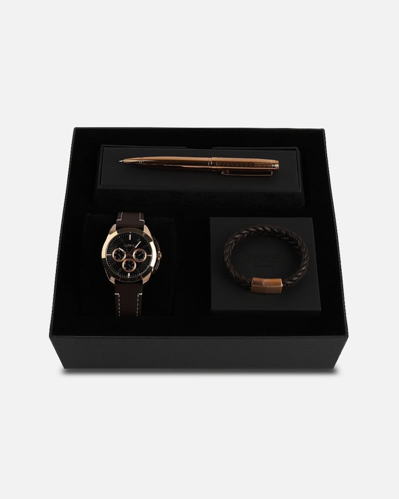طقم هديه رجاليه من زايروس ، يحتوي الطقم الرجالي على ساعه رجالية وإسواره رجاليه وقلم رجالي ، تتميز الساعه بتصميم كلاسيك بسير من الجلد باللون البني بميناء واسع وبتفاصيل أنيقه ، و تتميز الإسوره الرجاليه بتصميم راقي بسوار عريض من الجلد بلون بني بقفل معدني باللون الروز قولد ، ويتميز القلم الرجالي بتصميم كلاسيك بزخارف ونقوش دائريه متداخله ، قلم من المعدن باللون الروز قولد بحبر جاف بلون أزرق ، هذه الهديه هي الإختيار المناسب لكل رجل يحب التميز والتألق بإطلالته .