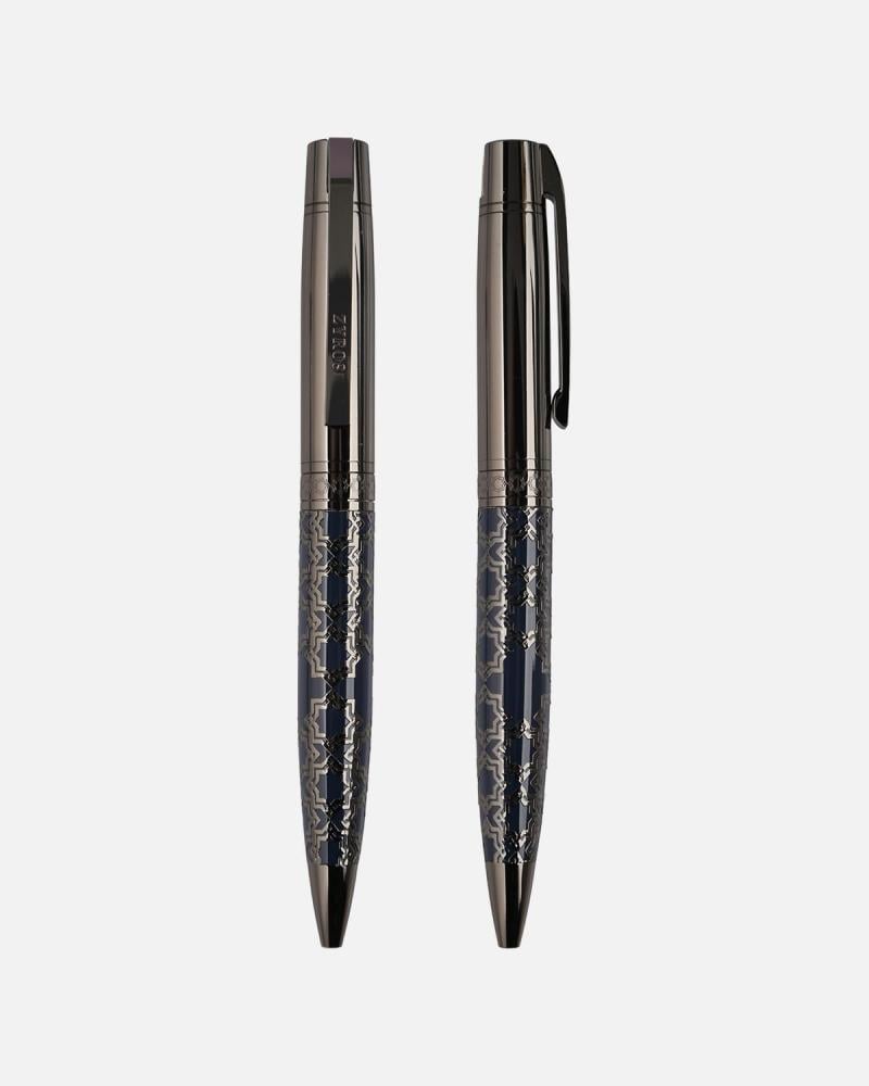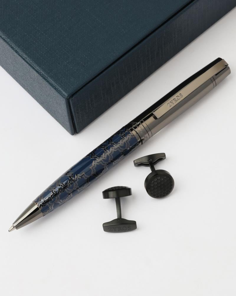 - القلم: قلم رجالي من المعدن باللون الأزرق والرمادي بحبر جاف بلون أزرق يتميز بطريقة قفل انسيابية تضمن عدم تسرب الحبر