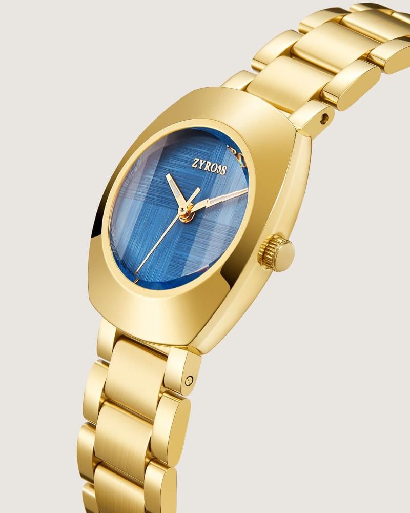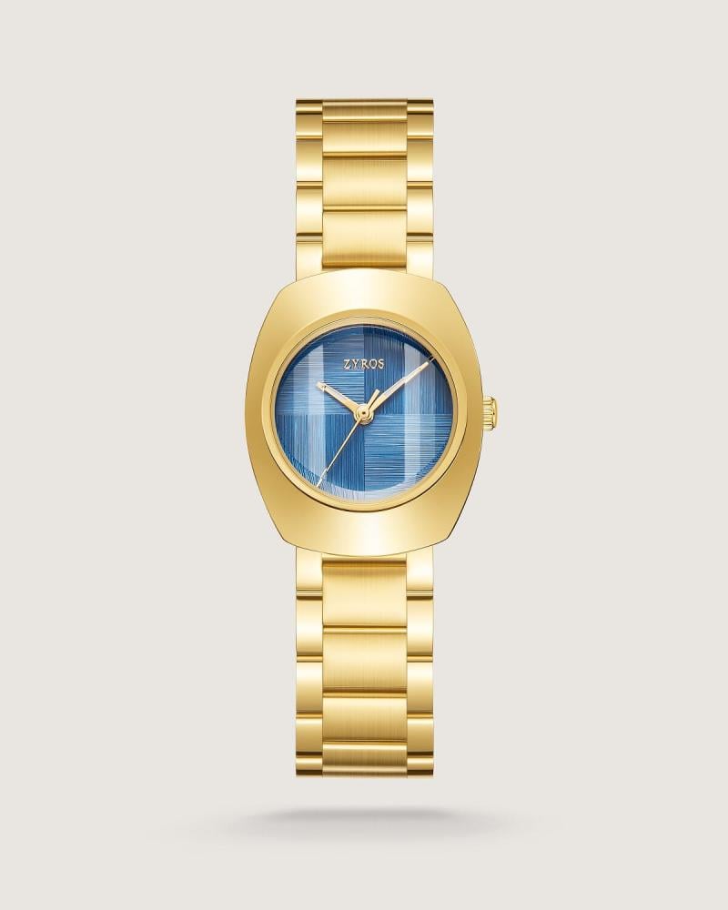 ميناء هذه الساعة يحكي فرادتها بتفاصيل تأسر النظر؛ الخلفية تنسج لوحة من الدقة والجمال، وإطارها الذهبي يحيط بها كإكليل فخر. كل عقرب يتحرك فيها وكأنه يخطّ نبض اللحظة بترف، ليجعل من الوقت قيمة، ومن الإطلالة حضورًا يحمل في داخله عزّة وحضور