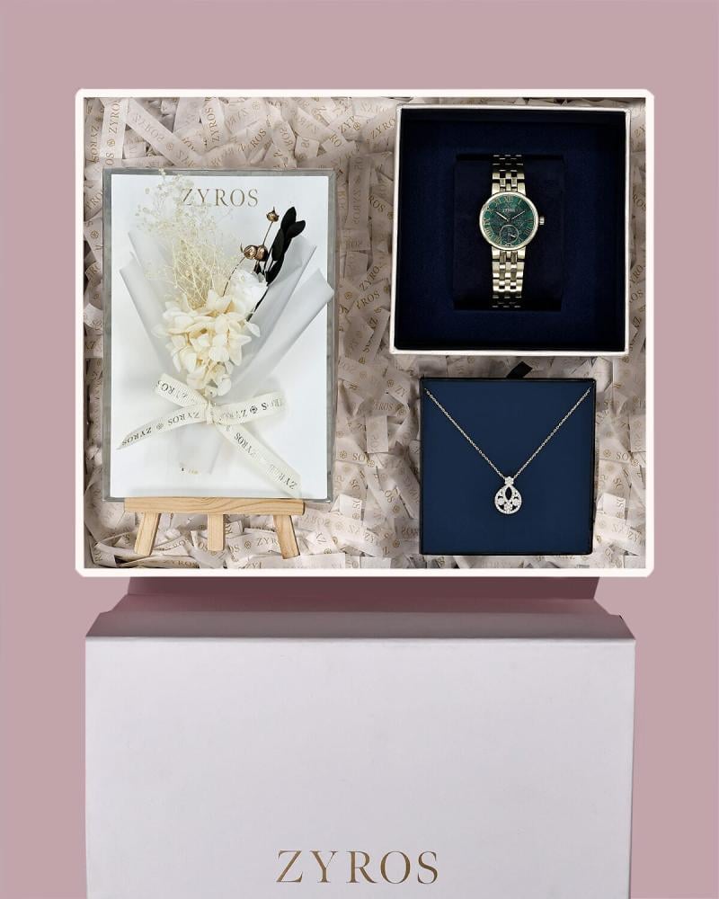 هذه الهدية الفاخرة تتميز بتصميم أنيق وراقي، حيث تحتوي على: ساعة يد بتصميم كلاسيكي أنيق، بسوار معدني مما يمنحها لمسة من الفخامة والأنوثة. سلسلة رقيقة تأتي بتصميم بسيط وناعم، مزينة بحجر أنيق في المنتصف، لتكمل مظهر الساعة بإحساس راقٍ ومتناسق. لوحة فنية تحمل باقة من الورد الدائم المجفف، مما يجعلها قطعة ديكور جميلة تضفي لمسة جمالية على أي مكان. كل هذه العناصر مرتبة بعناية داخل علبة فاخرة، مما يجعلها هدية مثالية للمناسبات الخاصة و المهمه ، أو حتى كهدية تقديرية راقية.