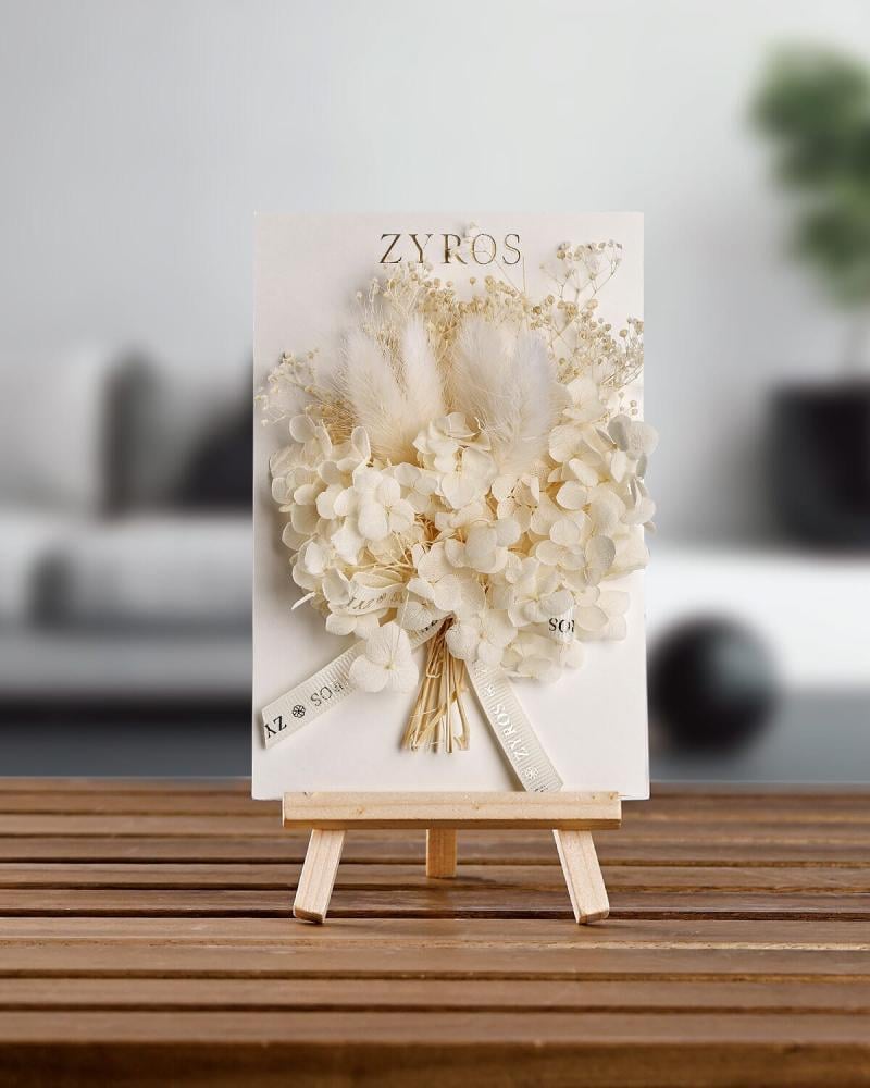 - . قطعة الديكور: لوحة صغيرة مثبتة على ستاند تتزين بباقة صغيرة من الورد الدائم