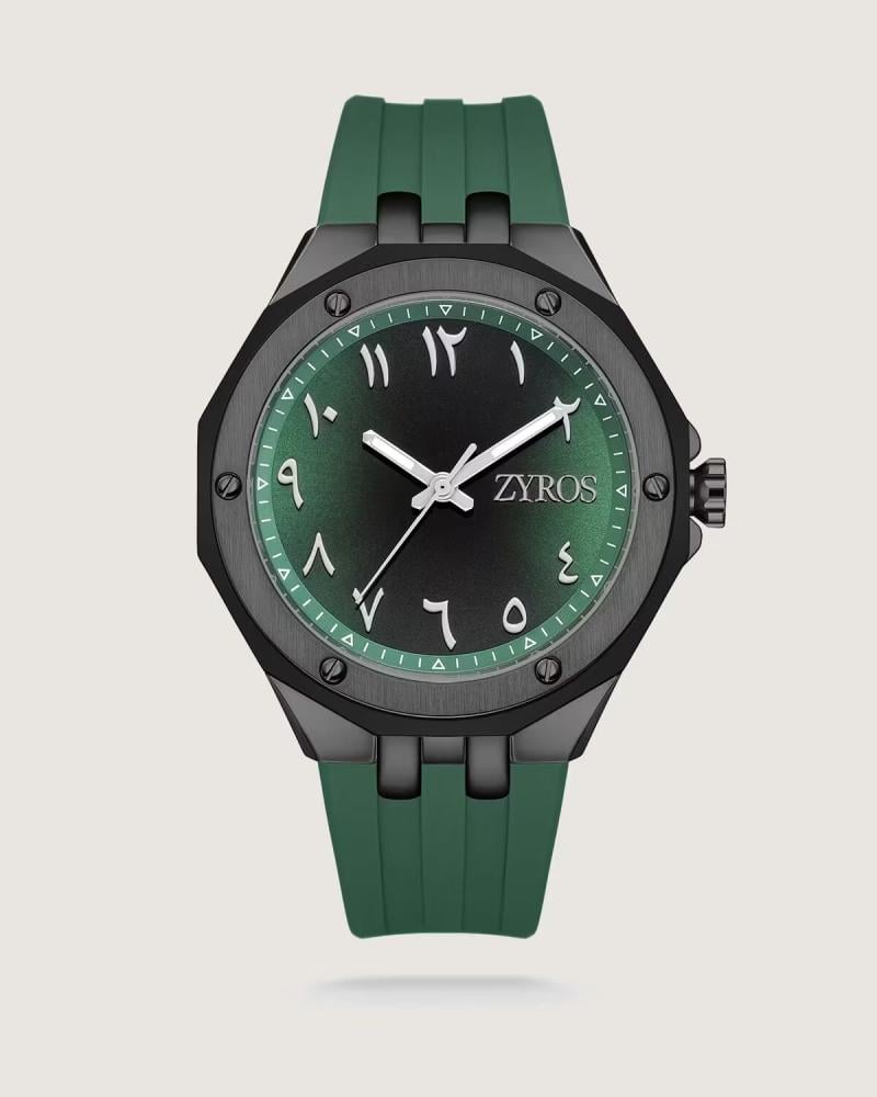 - ساعة رجالية بسير من الربل (المطاط) باللون الأخضر