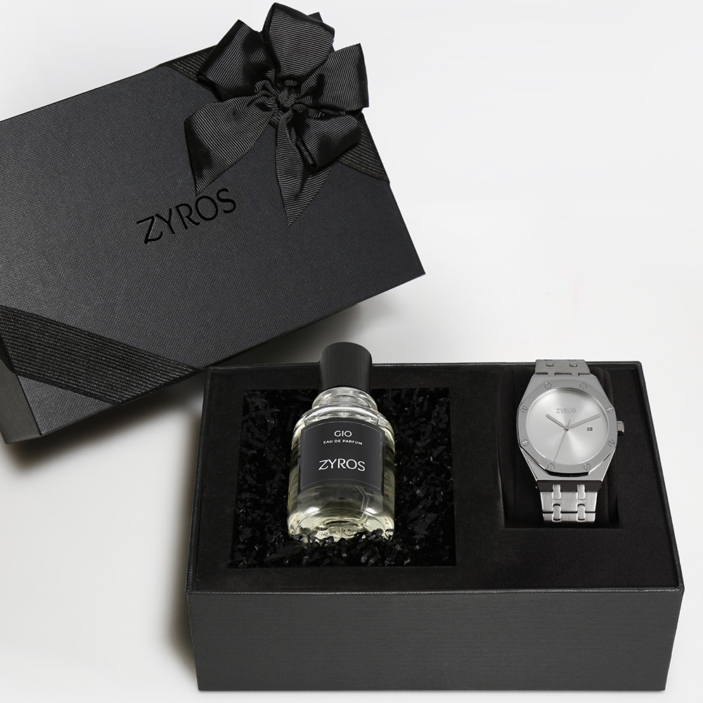 طقم هديه رجاليه فاخرة من ماركة زايروس ، إختاري بوكس هدية زايروس الرجالي المغلف بشكل مميز مع شريطة سودا، تحتوى الهديه على ساعه رجالية باللون الفضي المعدني ، و عطر جآيُو الرجالي الجذاب برائحه صيفيه ، هديه أنيقه تناسب كل مناسبتك المهمه .