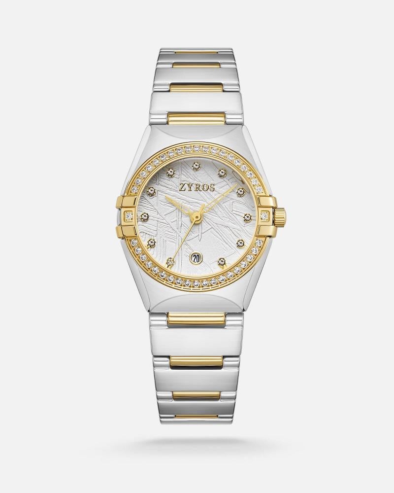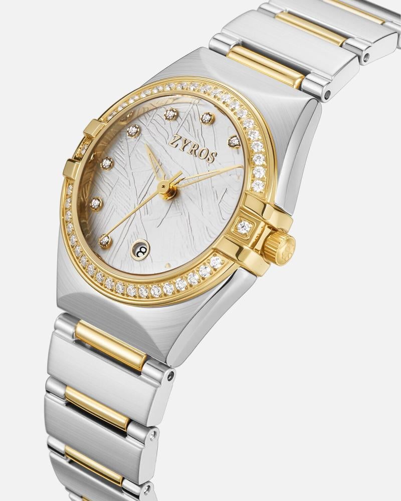 هذه الساعة تفيض فخامة هادئة لا تُقاوم؛ فهي متوجة بإطار مرصّع بفصوص متلألئة كأنها هالة من ضوء يحيط بالميناء. ميناؤها بلونه المتدرج بلمسات طبيعية يذكّر بصفاء القمر حين ينعكس على صفحة البحر، بينما السوار الذهبي المصقول يمنحها حضورًا ملكيًا راقٍ. إنها ساعة لا تكتفي بقياس الزمن، بل تحوّله إلى لوحة من البريق والترف، قطعة تُضيء معصمك وتمنحك إحساسًا أنيقًا يرافقك في كل لحظة.