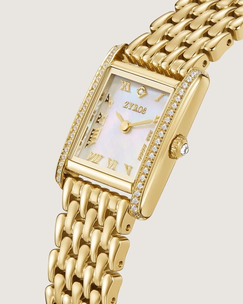 - الإطار: باللون الذهبي بشكل مستطيل مرصع بفصوص زركون براقة.