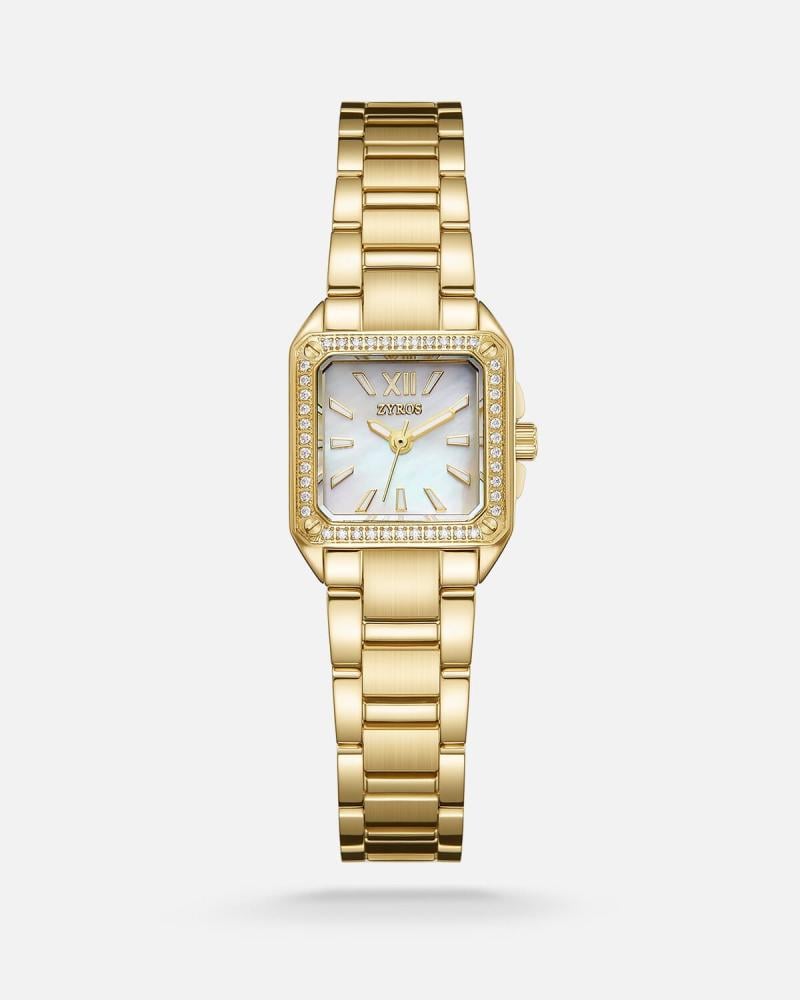 - الإطار: باللون الذهبي مرصع بفصوص الزركون اللامع.