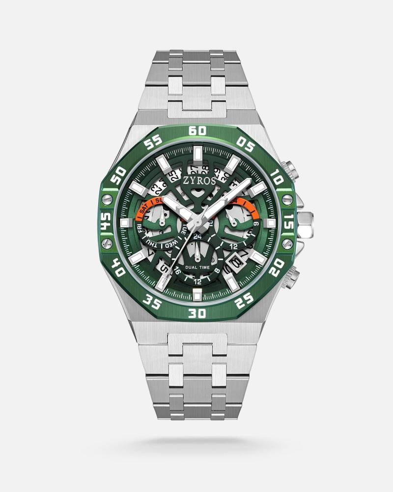 جرأة اللون، ودقة التصميم، تجتمعان في تحفة فنية على معصمك. هيكل من الفولاذ المقاوم للصدأ، بتصميم هندسي قوي، يجسد روح العصرية. ميناء بلون أخضر زمردي ساحر، يتناغم مع عدادات فرعية دقيقة، وعقارب مضيئة، تمنحك قراءة واضحة للوقت في جميع الظروف. سوار من الفولاذ المقاوم للصدأ، بتصميم متناسق، يمنحك راحة لا مثيل لها، وثباتًا يواكب إيقاع حياتك. حيث يلتقي التصميم الرياضي الأنيق بالفخامة الخالدة، لتكون إضافة مميزة إلى إطلالتك.