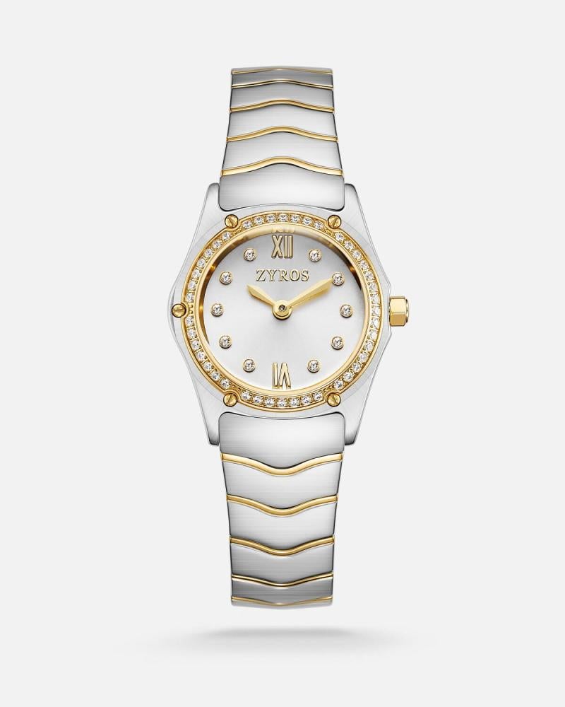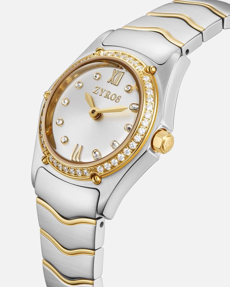 هذه الساعة تحمل حضورًا فريدًا يجمع بين الرقي والنعومة؛ إطارها المرصع بفصوص براقة يلتقط الضوء كنجوم تحيط بقمر هادئ، بينما يتدرج لون الميناء وكأنه صفحة سماء عند الفجر. السوار الذهبي بتصميمه المموج يضفي إحساسًا بانسيابية البحر وهدوء موجه، ليمنح الساعة لمسة أنثوية آسرة.
