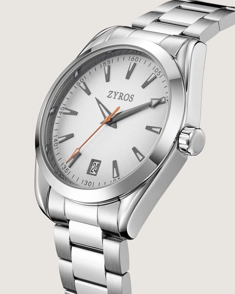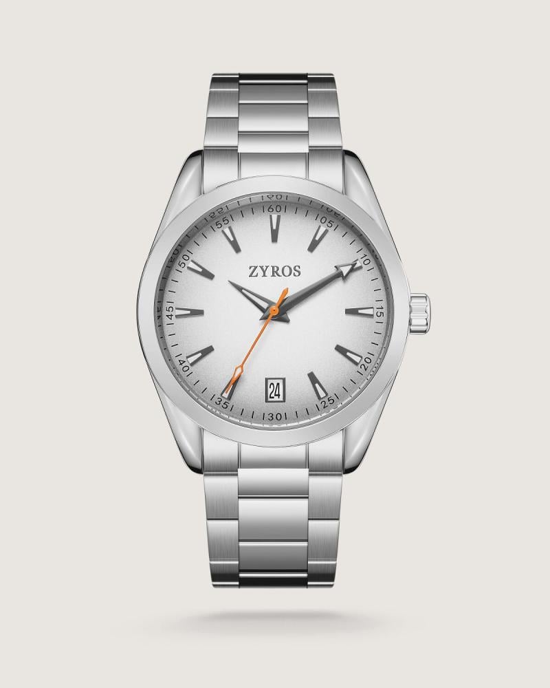 في هذه الساعة، يلتقي الزمن بالثبات. تصميمها يُحاكي وضوح الرؤية، وميناؤها المزيّن بنقوش دقيقة وأرقام للدقائق يروي سكونًا ووقارًا . عقارب تلامس الأرقام ورؤية واضحة للتاريخ ، كأنها تمرّ على محطات من المجد، وسوار معدني من الستيل مصقول يوحي بتفاصيل لا تُجامل في أناقتها. تفاصيل تحاكي طبع الرجال الذين يشبهون الأرض: ثابتين، وأصلهم عريق