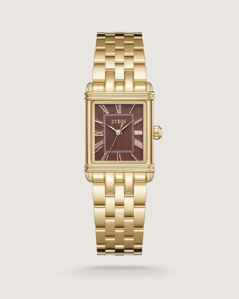 ساعة نسائية تنبض بالأنوثة والفخامة، يتألق ميناؤها المستطيل بأرقام رومانية تروي حكاية زمن راقٍ لا يبهت. خطوطها الهادئة تنسجم مع سوارها الذهبي لتصنع حضورًا استثنائيًا، كنبضة فخر خفيّة تلامس القلب وتُذكّر بروح وطن عزيز يظل شامخًا في الوجدان.