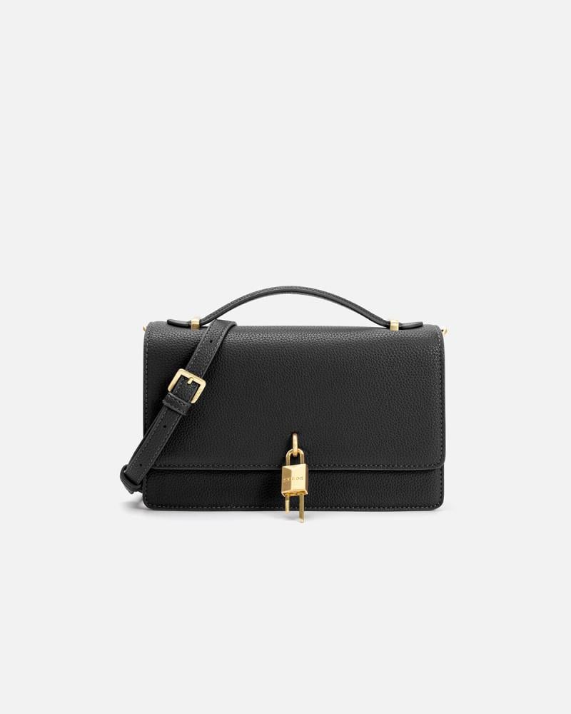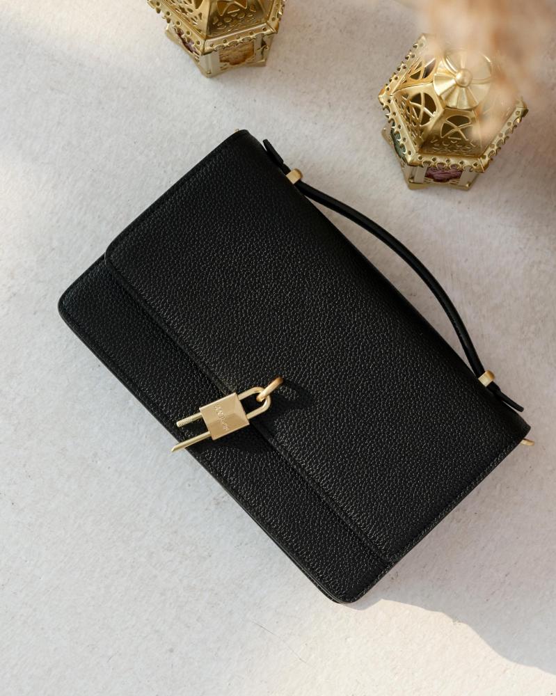 هذه الشنطة تجسيد للأناقة الراقية بلمسة من الغموض الساحر. بلونها الأسود العميق ونسيجها الجلدي الفاخر، تعكس هالة من القوة والرقي، كأنها قطعة من الليل تحمل أسرارك بأمان. تصميمها الهندسي البسيط يجعلها كلاسيكية خالدة، لكن القفل الذهبي المتدلّي في مقدمتها يضيف لمسة من الجرأة والجاذبية، كأنه سر ينتظر من يكتشفه. إنها ليست مجرد حقيبة، بل رمز للمرأة الواثقة التي تعرف كيف تجمع بين الغموض والجاذبية في كل خطوة .