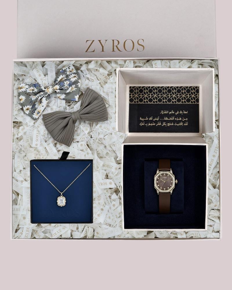بوكس أنيق يهمس بالفخامة والذوق الرفيع، يضم ساعة جلدية راقية تنبض بالأناقة، وسلسال مميز يكمّل كل إطلالة بلمسة ساحرة، مع مشابك شعر قماشية ناعمة تضيف لمسة عملية وجميلة. هدية تنسج بين الأناقة والاهتمام بالتفاصيل، مثالية لمن تعشق التميز في كل لحظة.