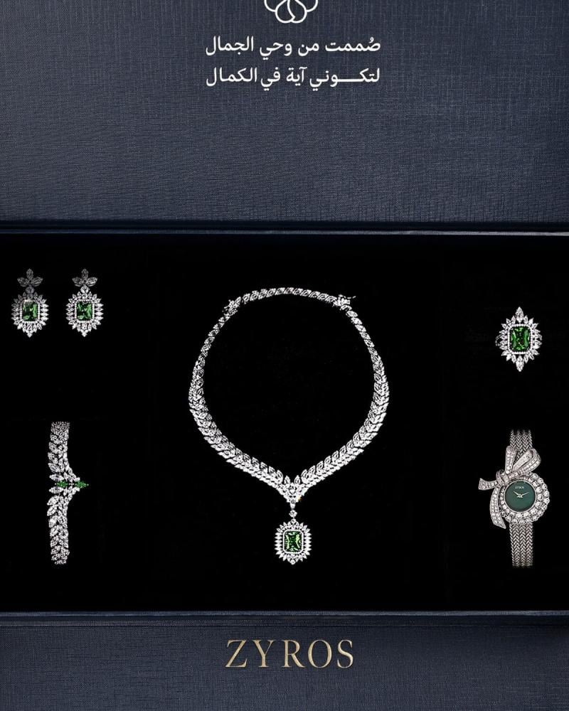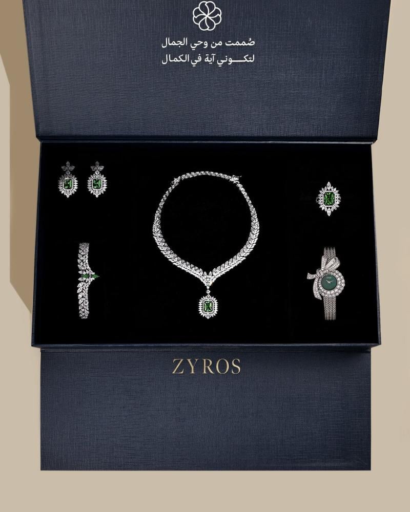 طقم يُجسّد الحضور الملكي بلمسة زمرديّة آسرة، تتناغم فيه أحجار الزركون البراقة مع تفاصيل أنيقة تنبض بالفخامة. عقد كأغصان الزيتون يُحيط العنق بجمال مهيب، وساعة تُحاكي سحر الزمن بربطة أنثوية خلابة. هدية لا تُهدى إلا لامرأة تعرف تمامًا قيمتها.