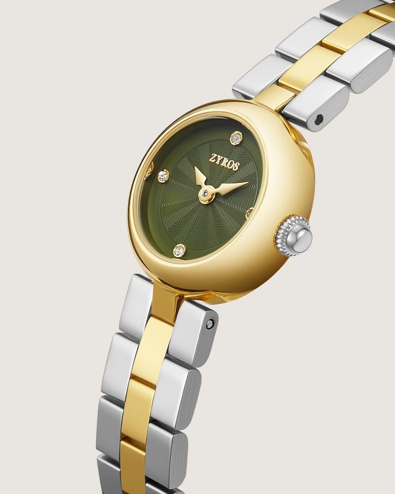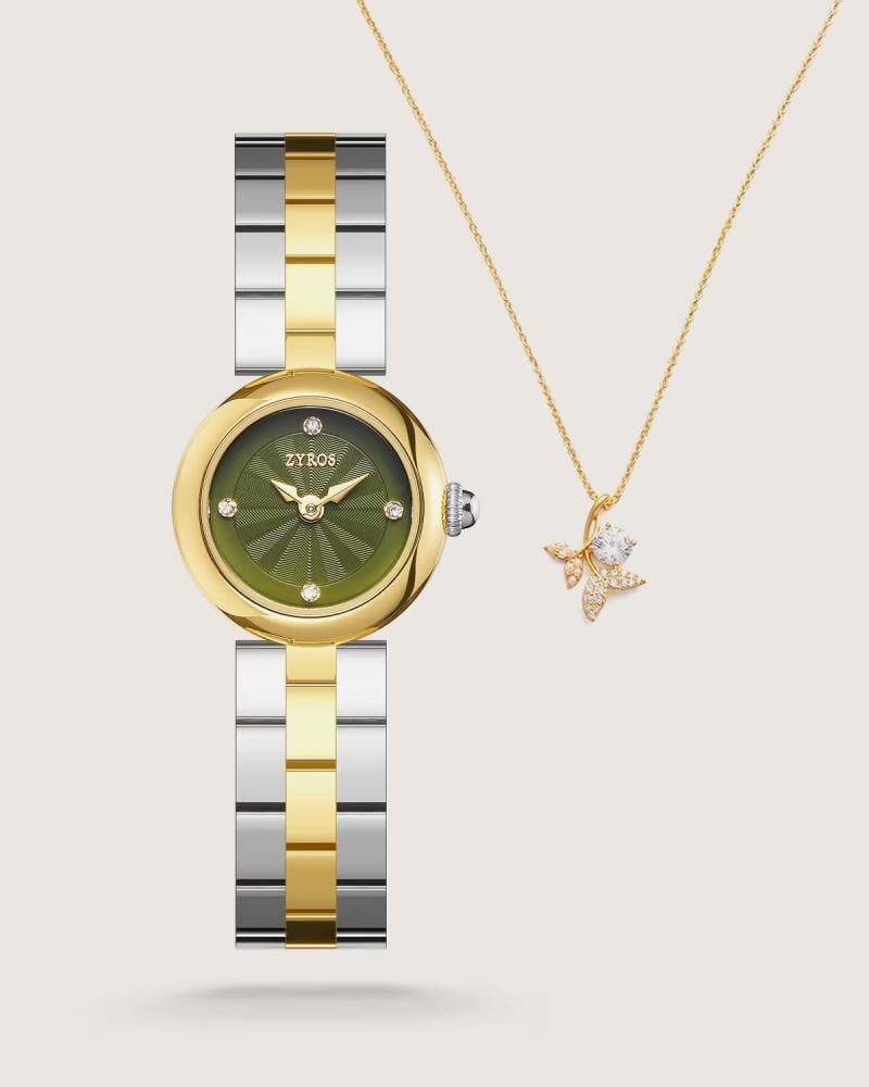 طقم يروي الأناقة النسائية، مكوّن من ساعة فاخرة ، وسلسال يتزين بفصوص من الزركون اللامع لتروي حكاية الفخامة، مزيج من القوة والذوق الرفيع لاطلالة تكتمل ببساطة.