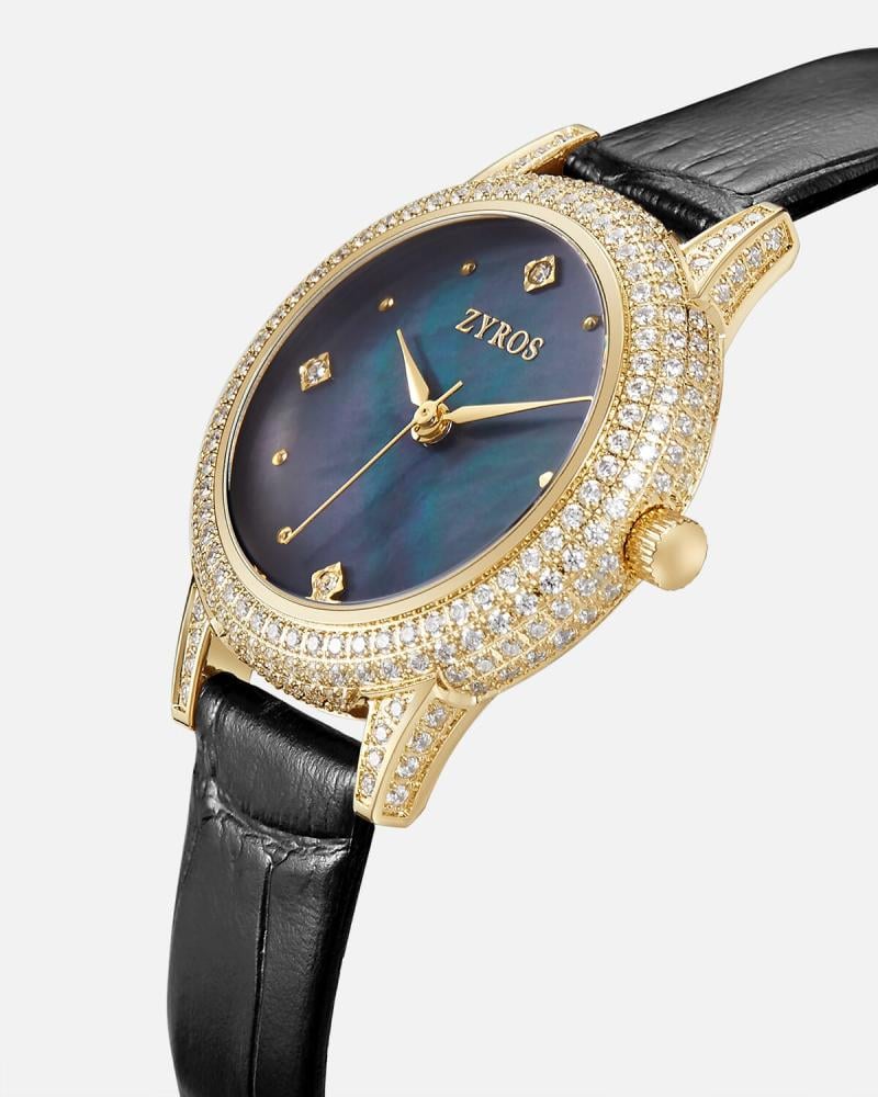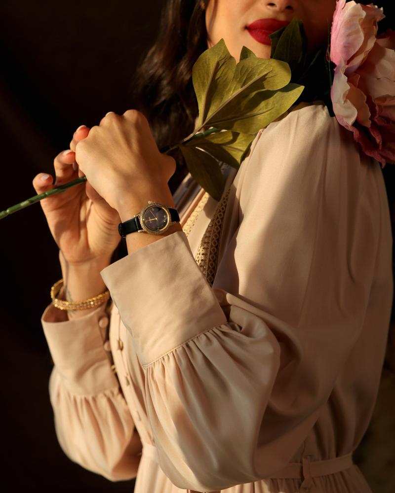 - إطار الساعة بلون ذهبي مرصع بفصوص من الزركون بمقاس : 28 mm