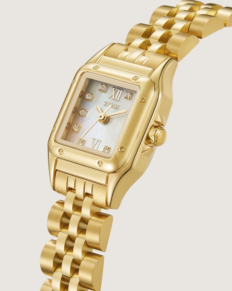 ساعة تفيض أناقة بلونها الذهبي اللامع، تحمل في ملامحها لمسة فاخرة وكبرياء يليق بك في وطنٍ عريق. تصميمها المربع الأنيق مع السوار المتماسك يرمز إلى الثبات، بينما بريقها يروي حكاية عز وفخر لا ينطفئ. إنها ليست مجرد ساعة تُرتدى، بل لمسة من الهيبة تذكرك أن الزمن يمضي، و النبض باقٍ في القلب نابضًا بالعزّة.