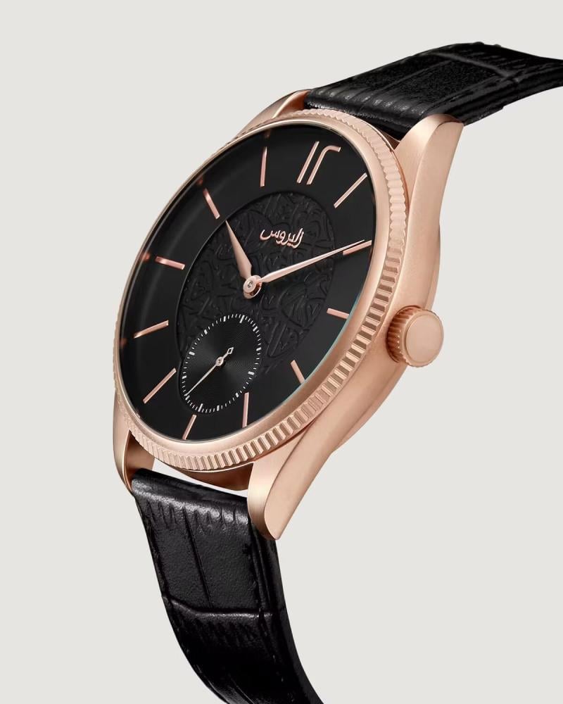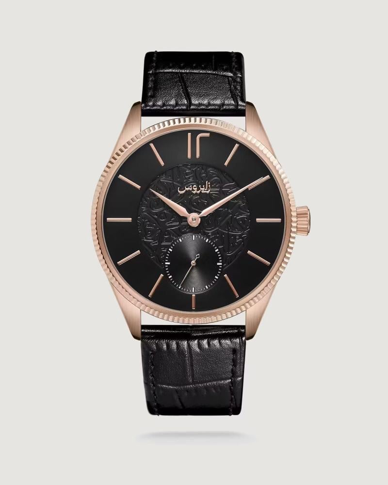 - ساعة بميناء باللون الأسود يتزين بزخارف الخط العربي وبإطار بلون روز قولد