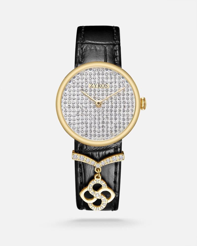 هذه الساعة تجسيدٌ للأناقة الراقية التي تهمس بالفخامة . تصميمها اللامع بإلميناء المصقول المرصّع بأحجار براقة تمنح لمعانًا خافتًا يشبه وميض الليل. تتدلى منها متعليقة تجسد معاني الأناقة، السوار الجلدي الأسود يعانق المعصم برقة، ليضفي لمسة من الترف العصري المتزن. إنها ليست مجرد ساعة، بل قطعة فنية تحكي حكاية الزمن بأسلوب متقن.