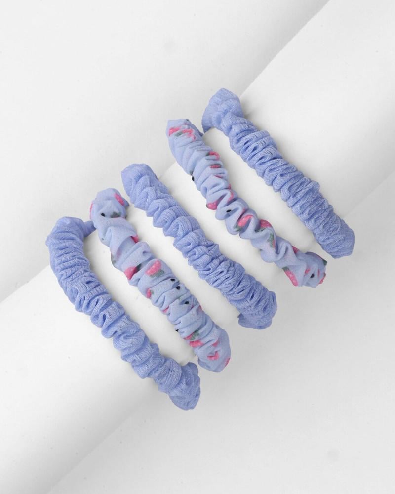 مجموعة من ربطات الشعر المصنوعة من قماش مطاطي مجعد، تتنوع بين التصاميم البسيطة والسادة باللون الأزرق، وأخرى مزينة بنقوش زهرية ناعمة تضفي لمسة أنثوية ساحرة. تتميز بحجمها المناسب للارتداء اليومي، مما يجعلها خيارًا عمليًا لإضافة لمسة أنيقة وعفوية إلى تسريحات الشعر.