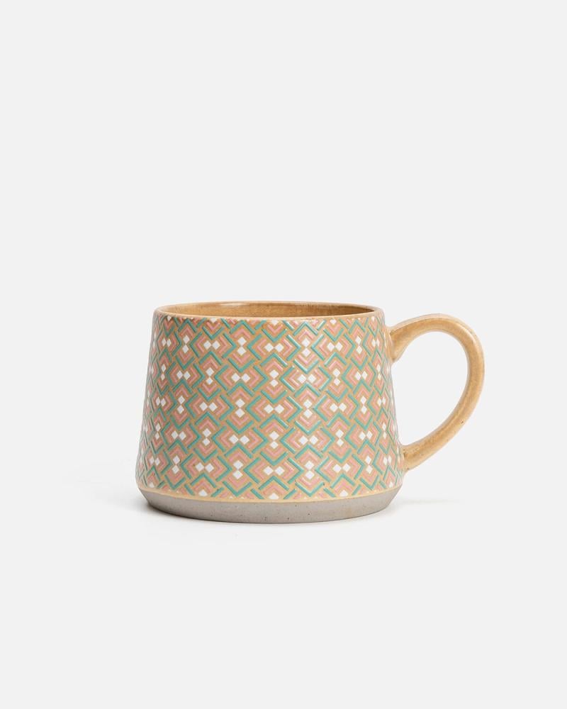 كوب أنيق بتصميم خطوط هندسية بارزة ينسج الفن في تفاصيله ، بلون ناعم يضفي لمسة من الفختمة والدفء على كل رشفة.