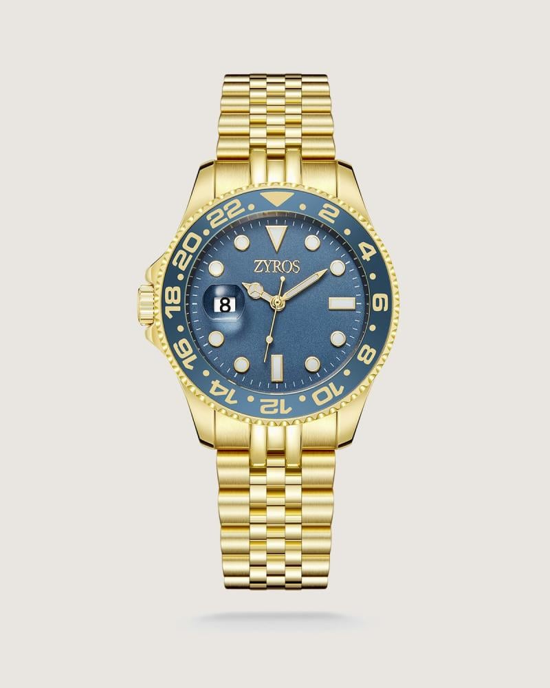 - ساعة بميناء باللون الأزرق وبإطار بلون ذهبي وازرق