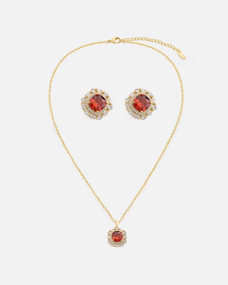- يتميز الطقم بتصميم مميز بحلية بشكل دائري مرصعة بفصوص الزركون اللامع وتتزين بحجر زركون بلون أحمر