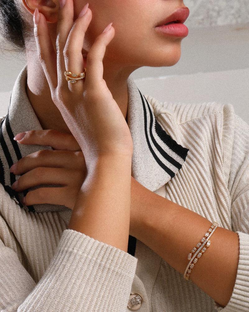 طقم فاخر، مرصع بأحجار وفصوص الزركون المتراصة في تناغم مذهل، حيث تتسلسل الفصوص عبر التصميم العريض بشكل متتابع يشبه زخرفة توازي الأفق. الأحجار اللامعة تتداخل بسلاسة مع الفصوص الدقيقة، مما يخلق إطلالة مشرقة ومبهرة تأسر الأنظار. تصميم الطقم يضيف له هيبة وجمالًا استثنائيًا، ليمنح اطلالتك لمسة من الفخامة الفائقة.