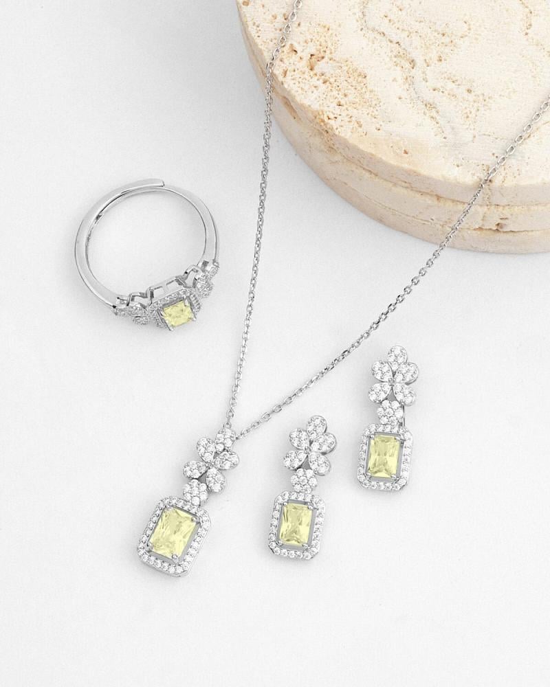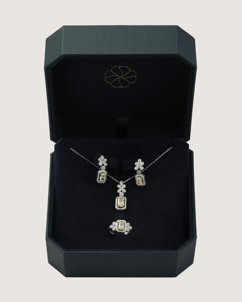- وصف الطقم : طقم من سلسال وحلق وخاتم مرصع بفصوص الزركون اللامع وبحجر زركون بلون أصفر.