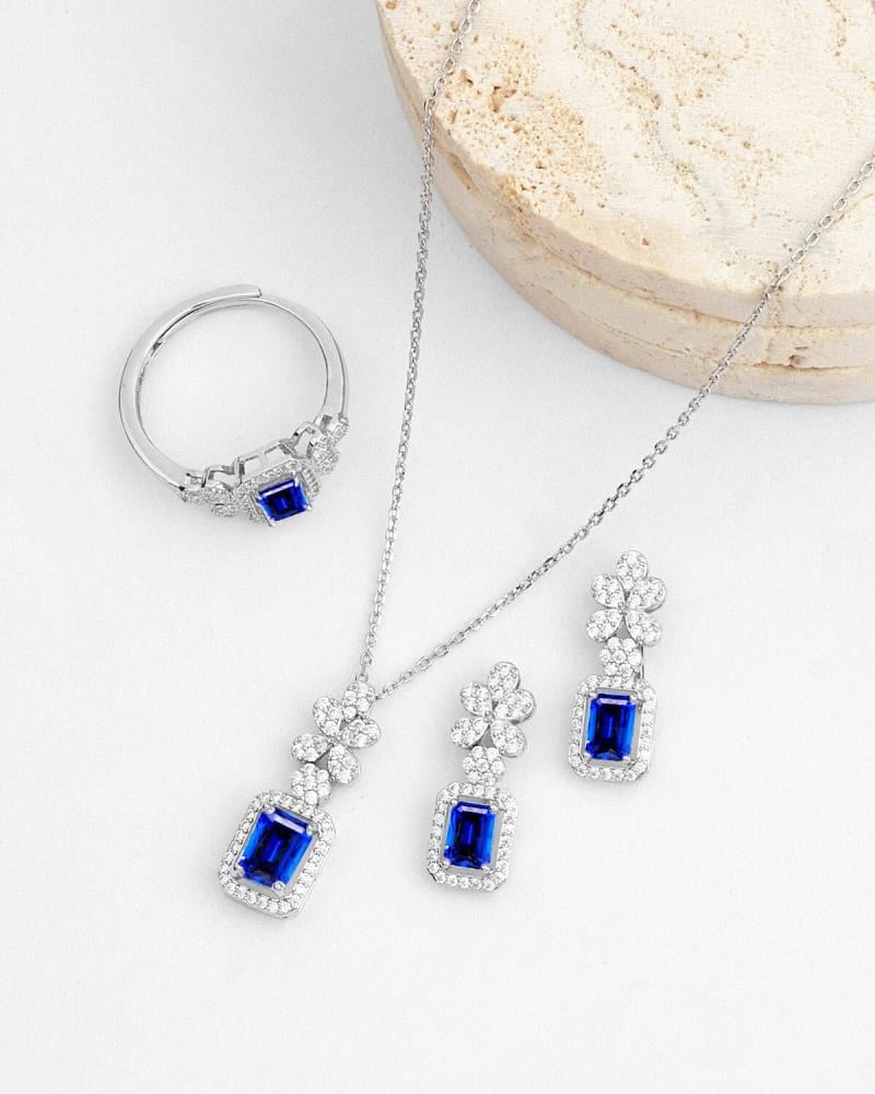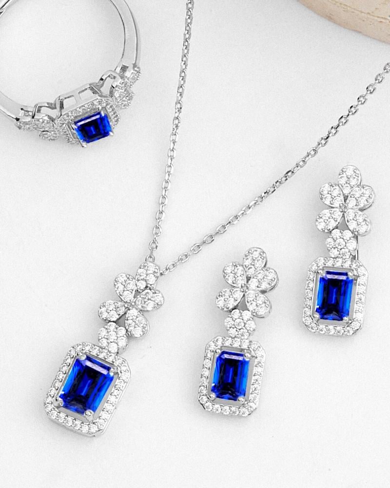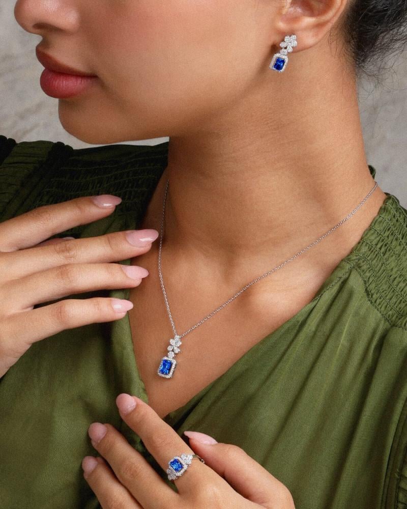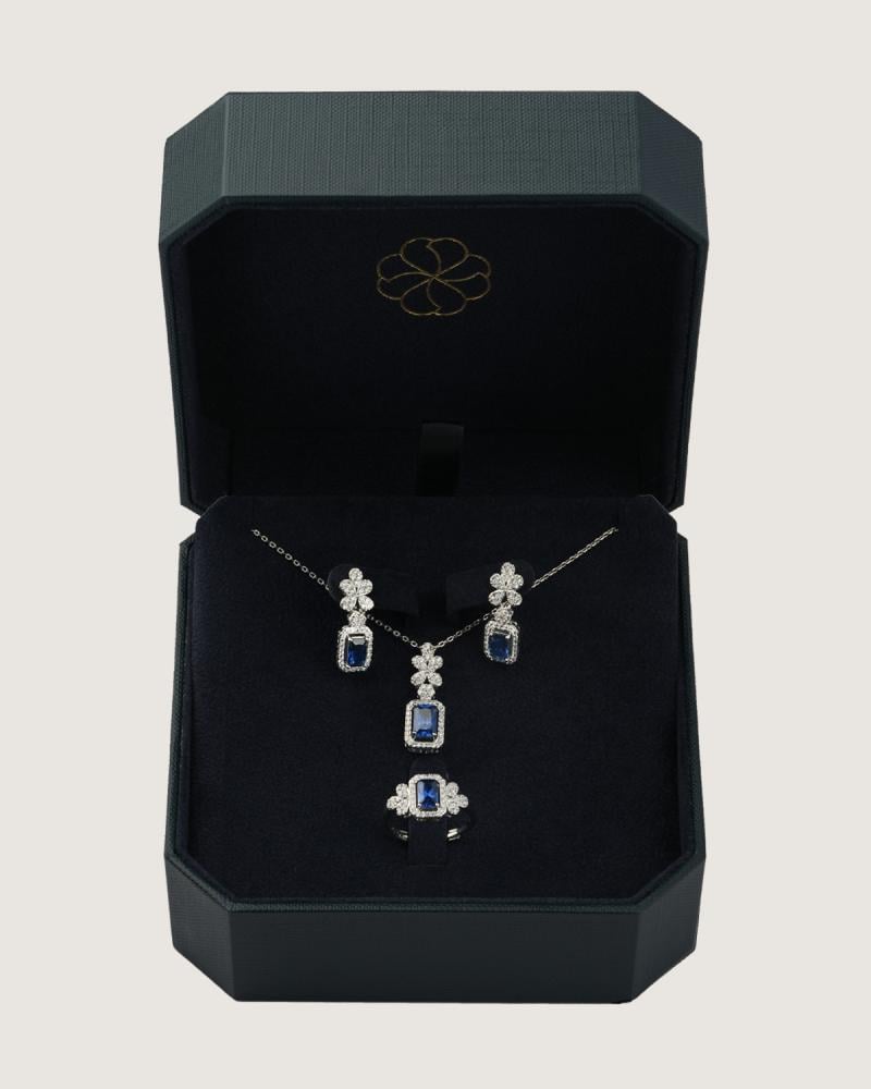 - وصف الطقم : طقم من سلسال وحلق وخاتم مرصع بفصوص الزركون اللامع وبحجر زركون بلون أزرق.