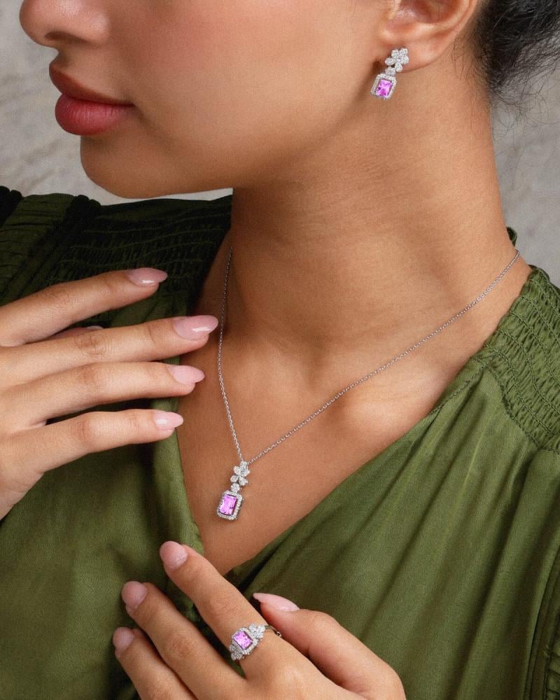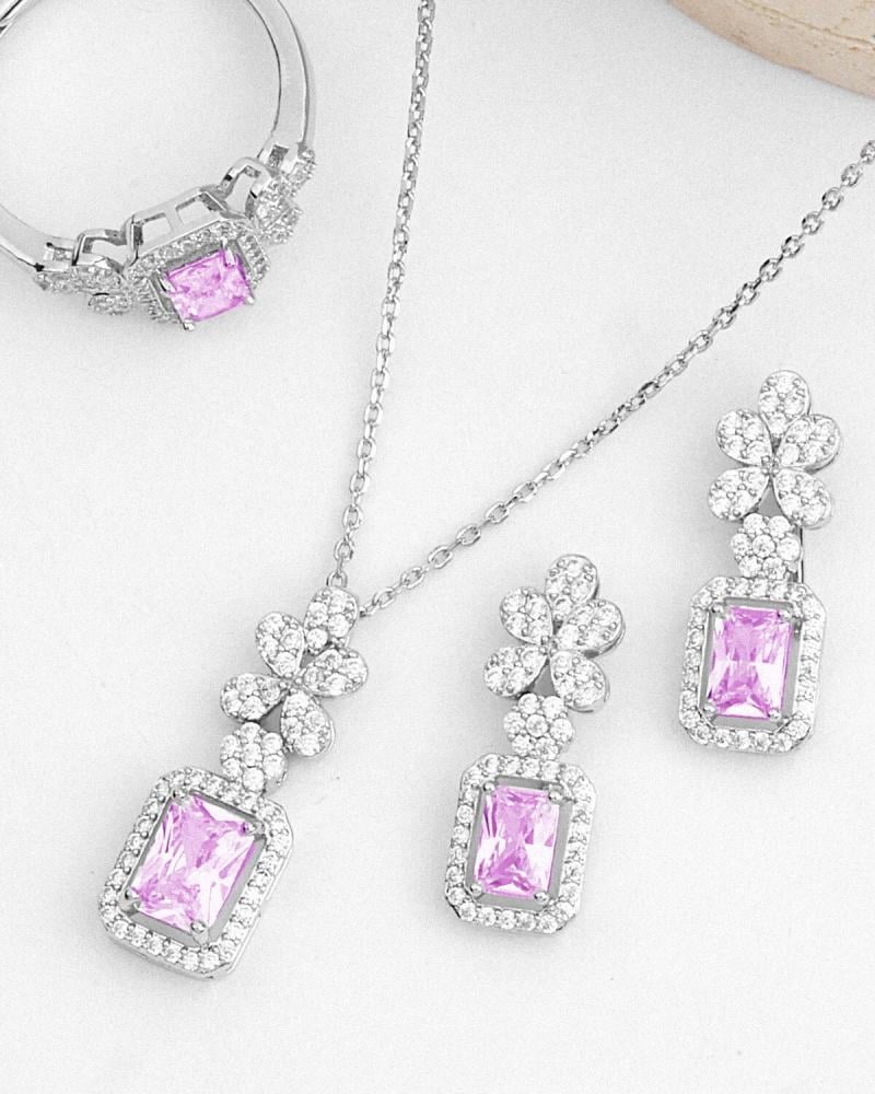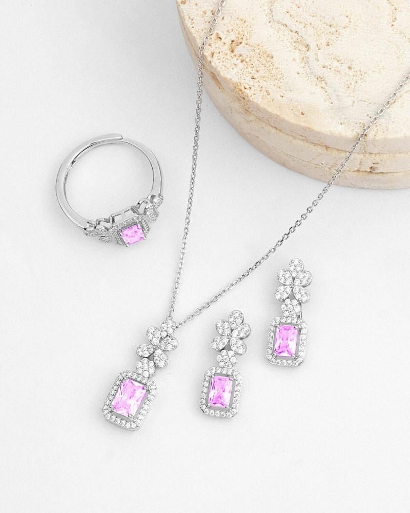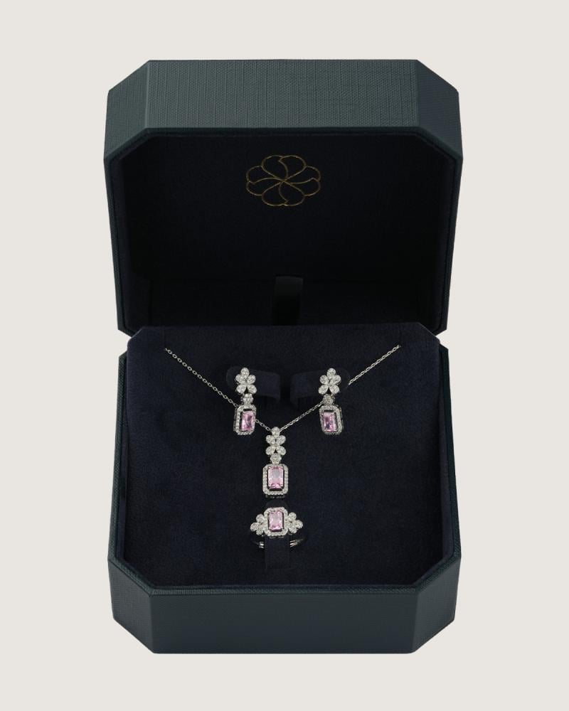 - وصف الطقم : طقم من سلسال وحلق وخاتم مرصع بفصوص الزركون اللامع وبحجر زركون بلون وردي.