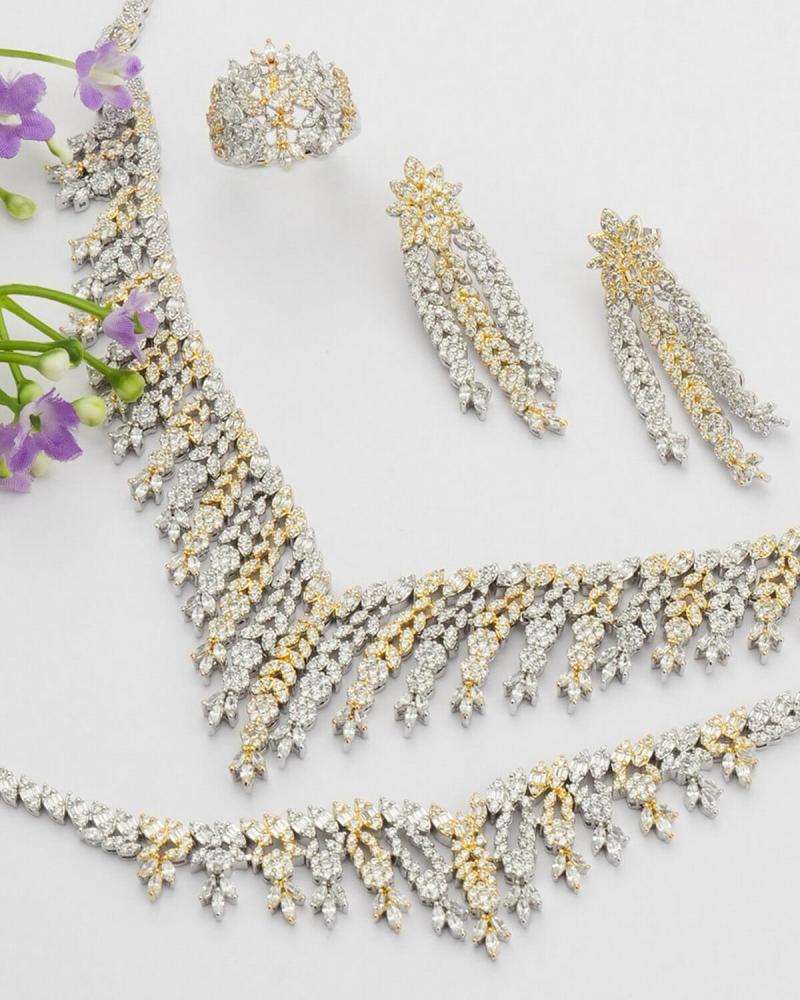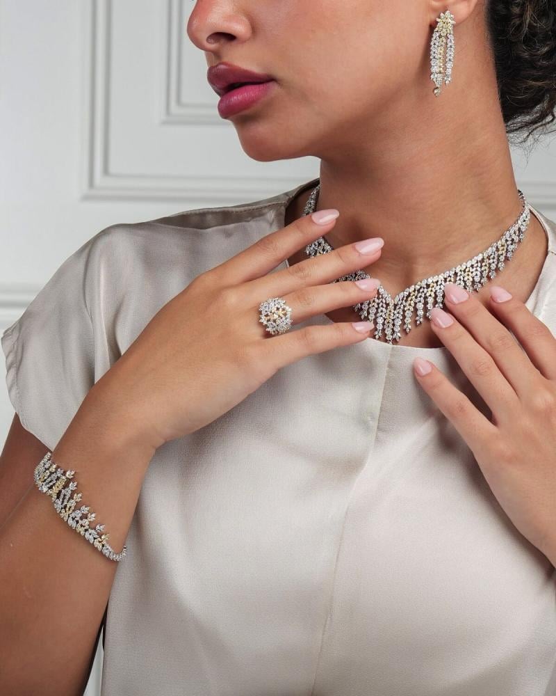 - وصف الطقم : طقم من عقد و اسوارة وخاتم وحلق بتصميم فاخر منسدل برقة و مرصع بأحجار وفصوص الزركون اللامع .