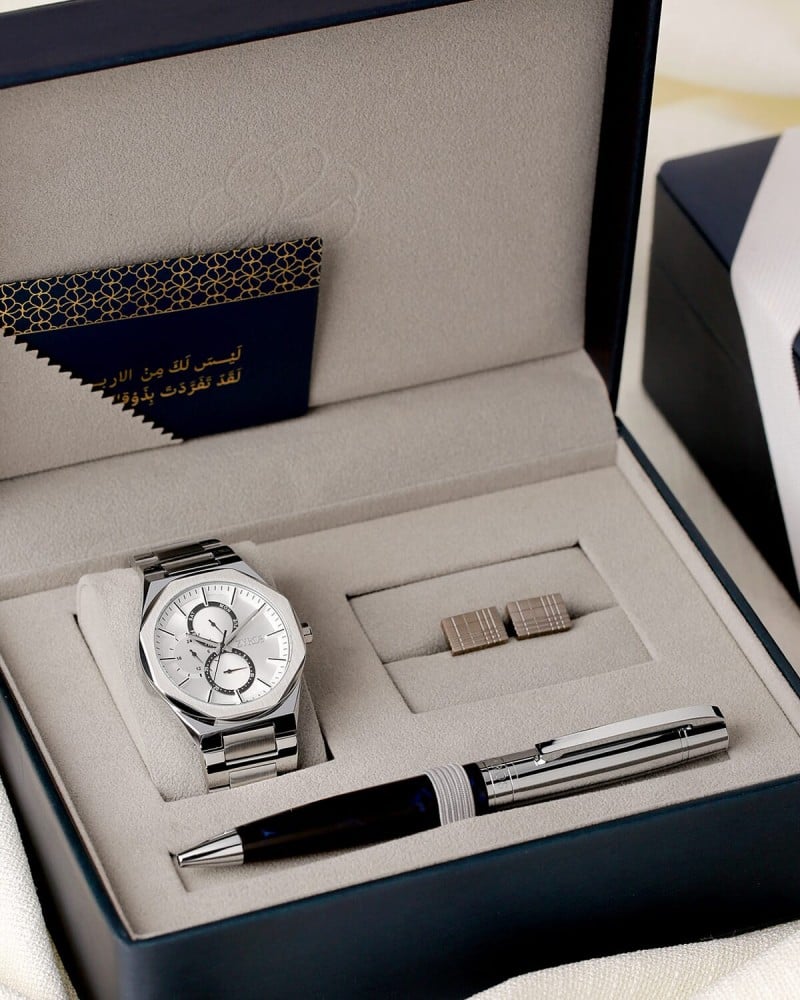 - A luxury men's gift set consisting of a watch, a cufflink and a pen