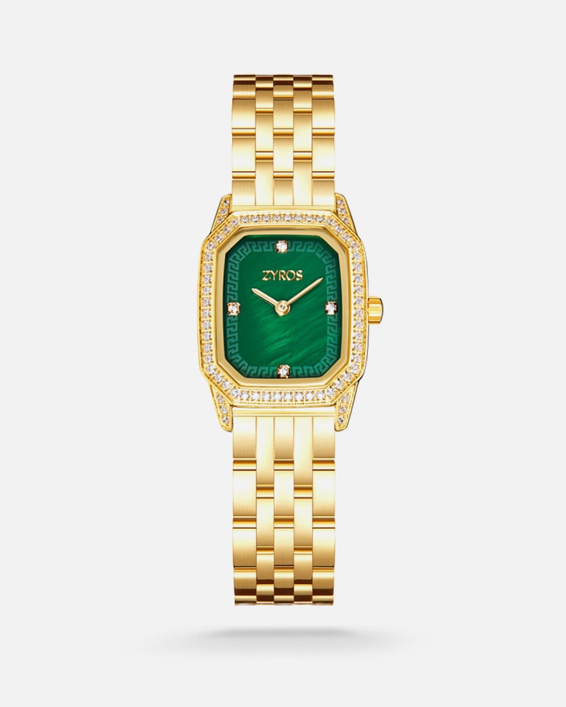 ساعة نسائيه من ماركة زايروس بسوار من الستانلس ستيل باللون الذهبي ، ساعه تتميز بلمسة من الاناقة الكلاسيكية ، فميناء الساعه النسائيه صمم بشكل هندسي أنيق وهادئ بلون أخضر ، تضيف هذه الساعة الكثير من التميز والاصاله لإطلالتك. يمكنك تنسيق الساعة مع إطلالتك في يومك الجامعي الطويل ا، يمكنك تنسيق الساعه مع إطلالتك الرسميه ، هذه الساعة صممت لتكون الاختيار الاول لك دائما .