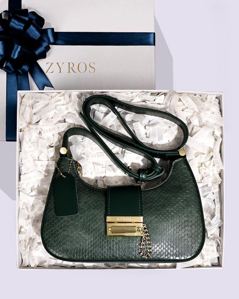 - وصف الشنطة: شنطة من الجلد النباتي الفاخر بلون أخضر ، مُزيّنة بتفاصيل باللون الذهبي، شنطة تجمع بين السعة وأناقة التصميم، لتكون خيارك الأول في أيامك الحافلة.