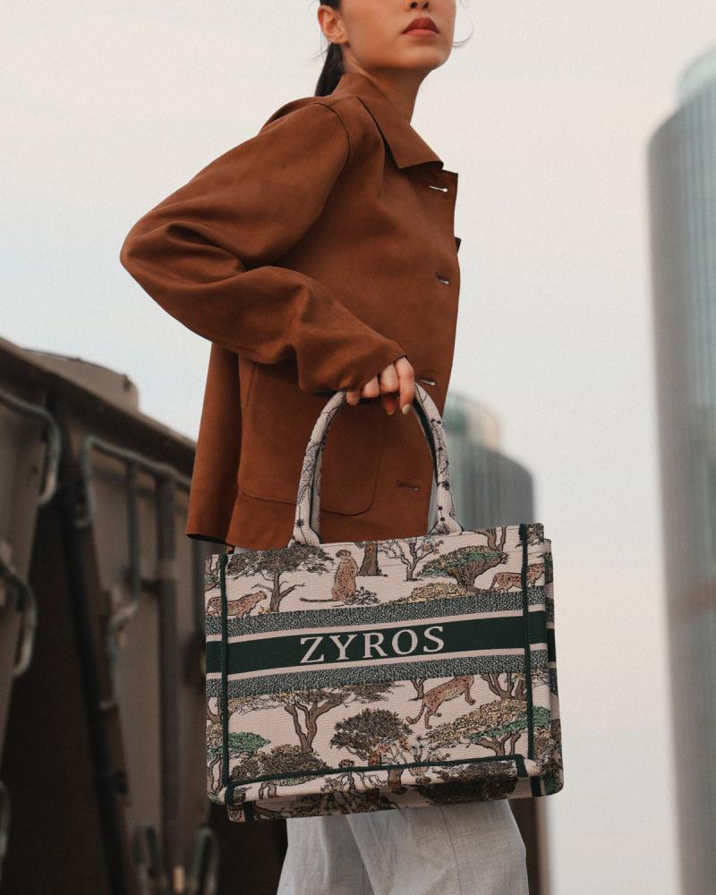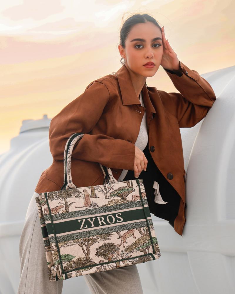 - شنطة نسائية من القماش باللون البيج و الأخضر يتزين بطبعات وتطريز مميز