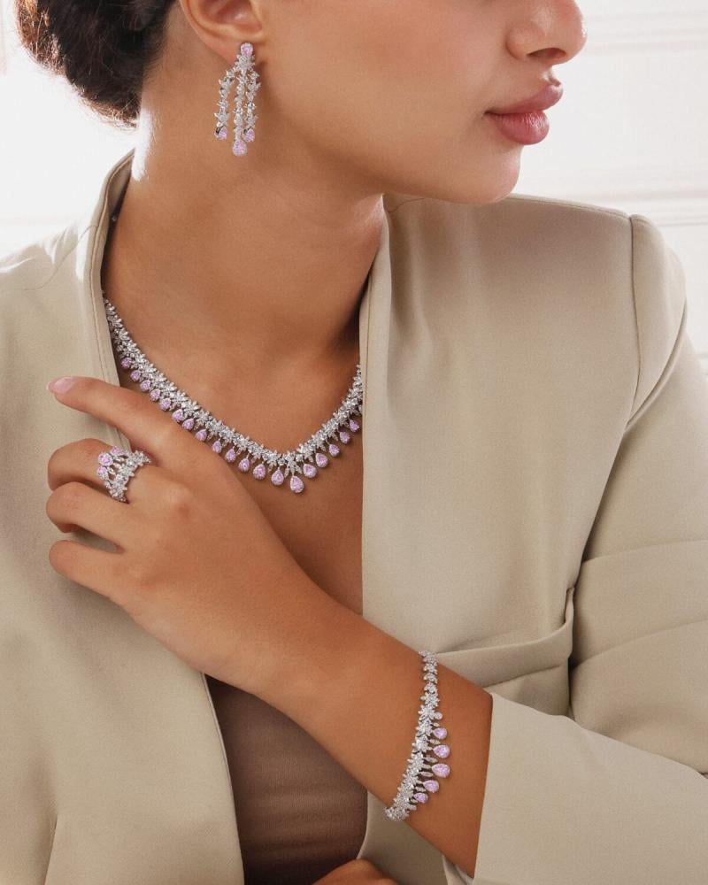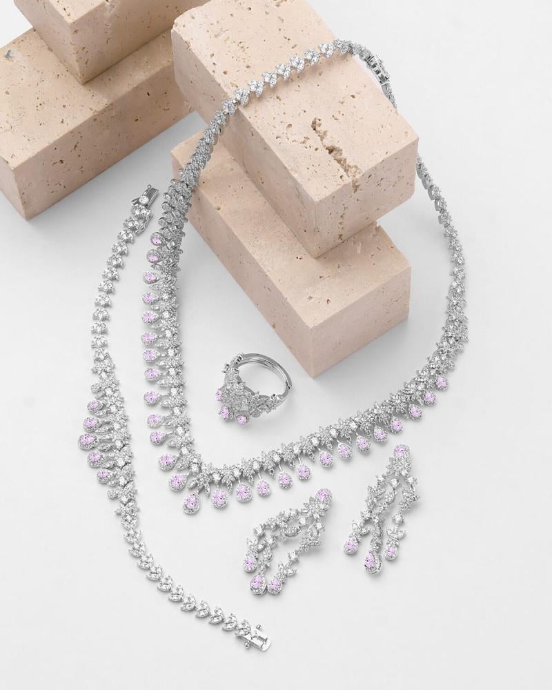- وصف الطقم : طقم من سلسال وحلق وخاتم واسوارة مرصع بفصوص الزركون اللامع وبأحجار زركون بلون وردي .