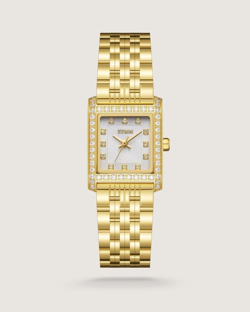 ساعة نسائية من الستيل، بمينا مربّع يفيض أناقة، يزدان بفصوص زركون تحلّت مكان الأرقام وتزيّنت بها أطراف الإطار، فتشع كحبات ضوء تحاكي نجوماً تحرس سماء الوطن. تصميم يحمل في بريقه أنوثة رقيقة وفخرًا صامتًا، يجمع بين الفخامة والعاطفة بلمسة خالدة
