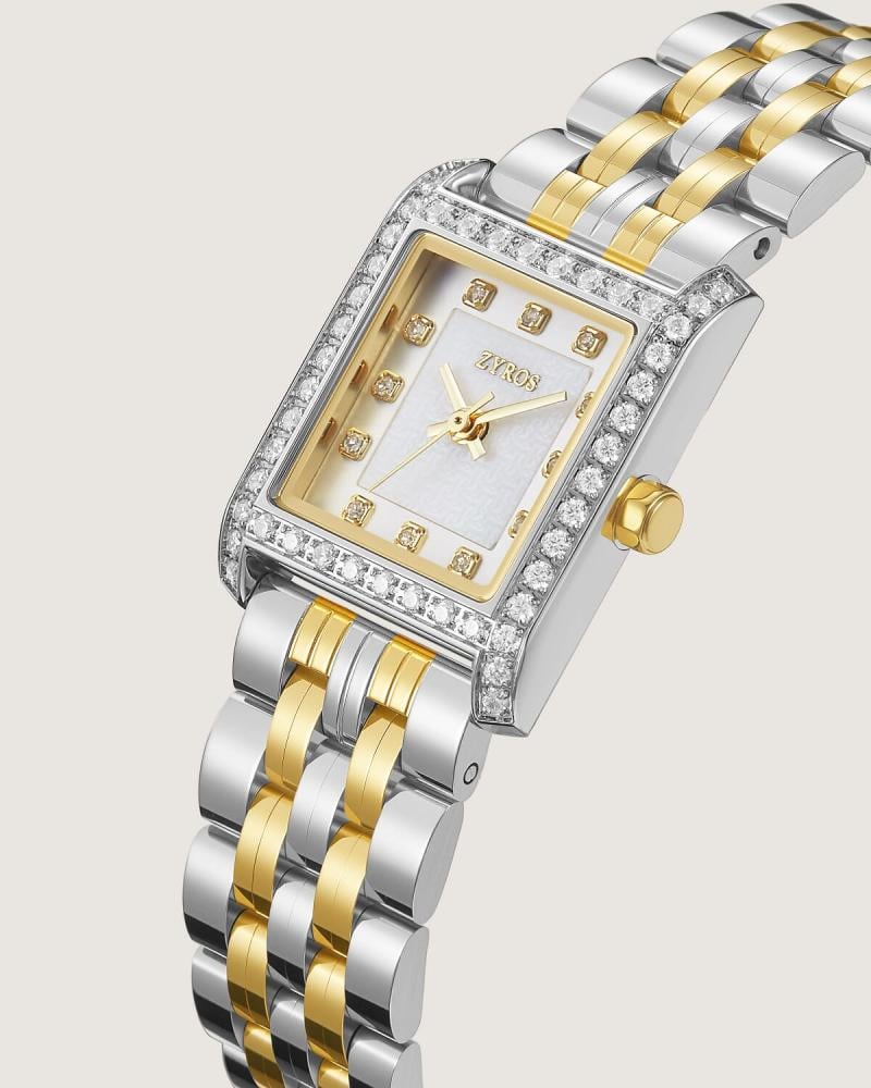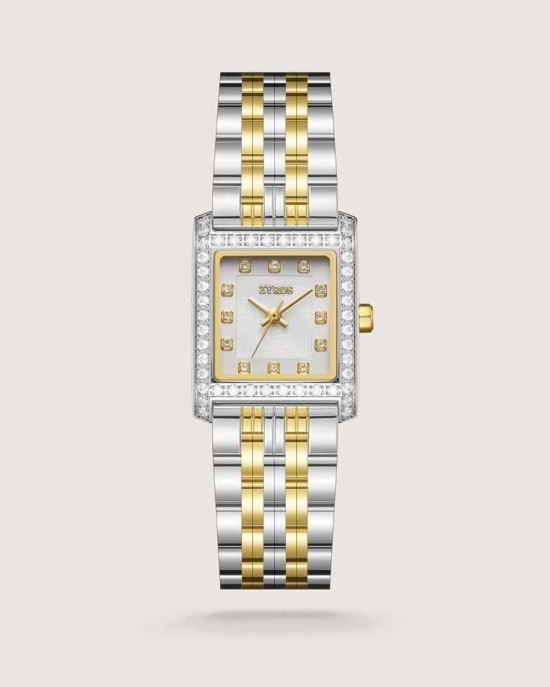 ساعة نسائية من الستيل، بمينا مربّع يفيض أناقة، يزدان بفصوص زركون تحلّت مكان الأرقام وتزيّنت بها أطراف الإطار، فتشع كحبات ضوء تحاكي نجوماً تحرس سماء الوطن. تصميم يحمل في بريقه أنوثة رقيقة وفخرًا صامتًا، يجمع بين الفخامة والعاطفة بلمسة خالدة