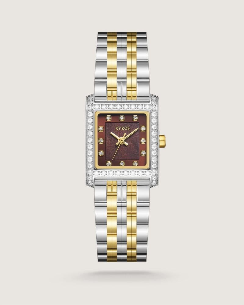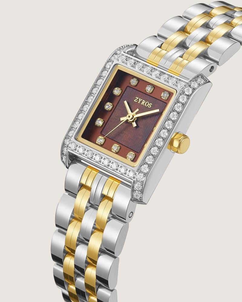 ساعة نسائية من الستيل، بمينا مربّع يفيض أناقة، يزدان بفصوص زركون تحلّت مكان الأرقام وتزيّنت بها أطراف الإطار، فتشع كحبات ضوء تحاكي نجوماً تحرس سماء الوطن. تصميم يحمل في بريقه أنوثة رقيقة وفخرًا صامتًا، يجمع بين الفخامة والعاطفة بلمسة خالدة