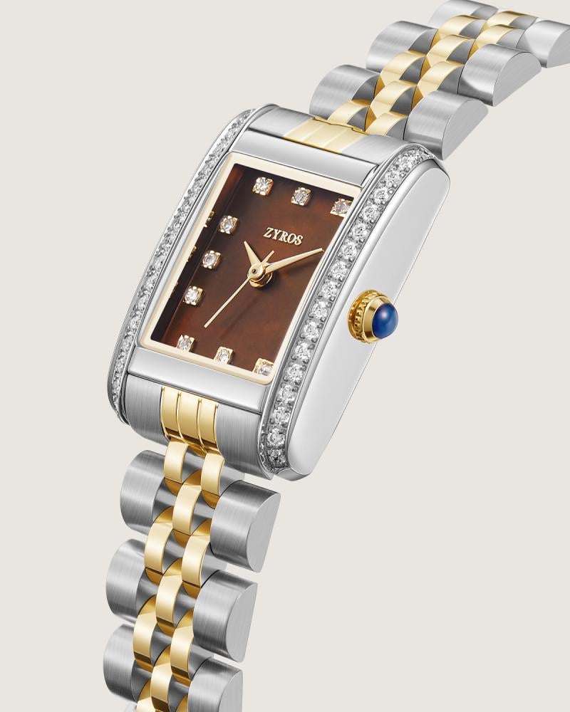 ساعة نسائية من الستيل، بمينا مستطيل يفيض أناقة، يزدان بفصوص زركون على الإطار، فتشع كحبات ضوء تحاكي نجوماً تحرس السماء. تصميم يحمل في بريقه أنوثة رقيقة وفخرًا صامتًا، يجمع بين الفخامة والعاطفة بلمسة خالدة