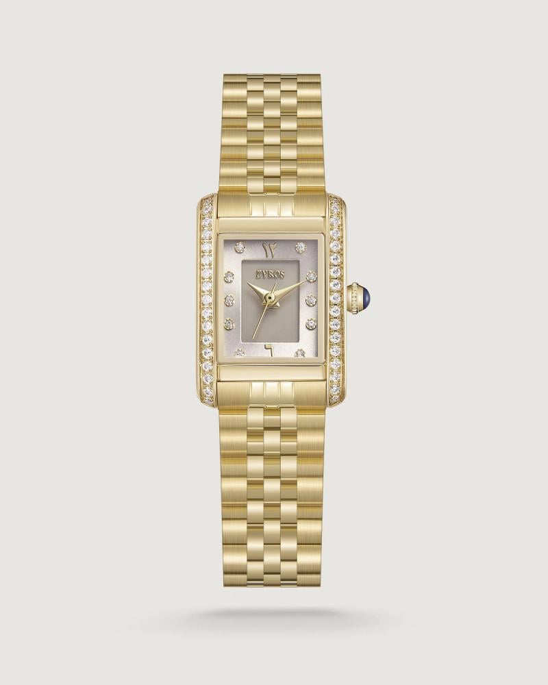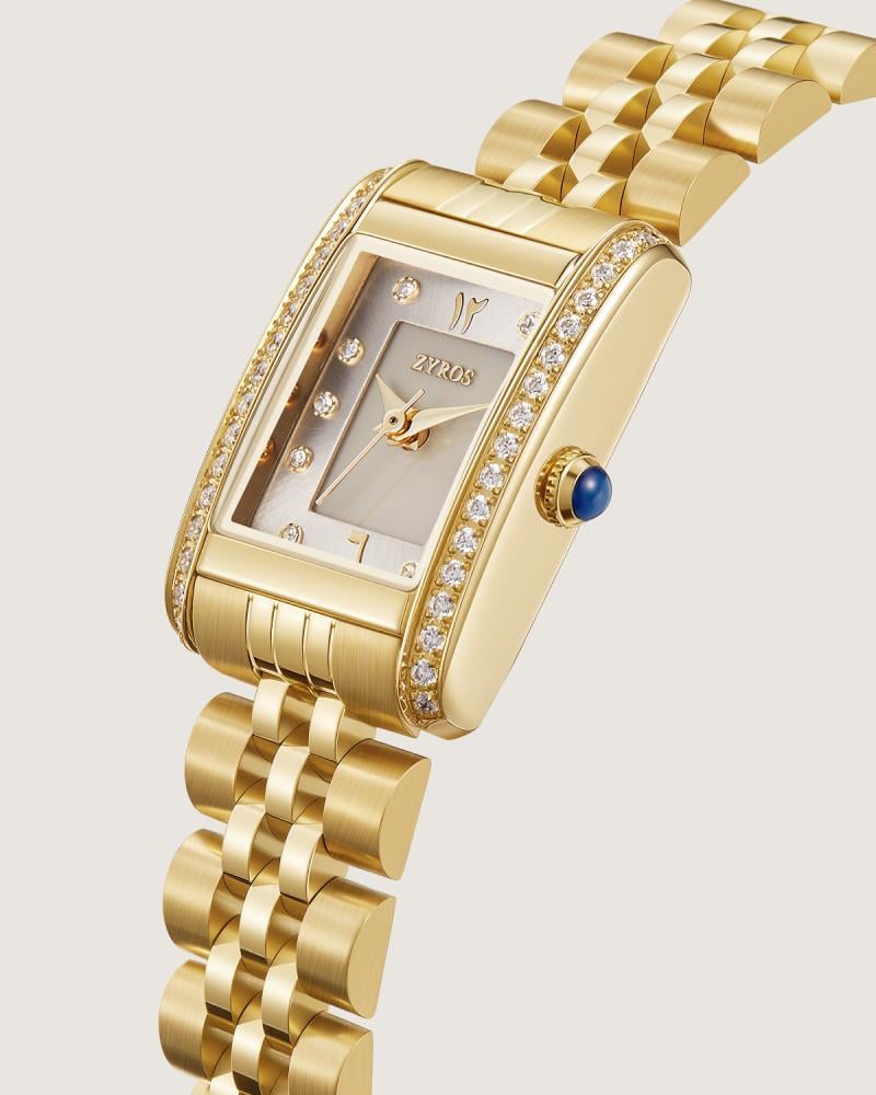 ساعة نسائية من الستيل، بمينا مستطيل يفيض أناقة، يزدان بفصوص زركون على الإطار، فتشع كحبات ضوء تحاكي نجوماً تحرس السماء. تصميم يحمل في بريقه أنوثة رقيقة وفخرًا صامتًا، يجمع بين الفخامة والعاطفة بلمسة خالدة