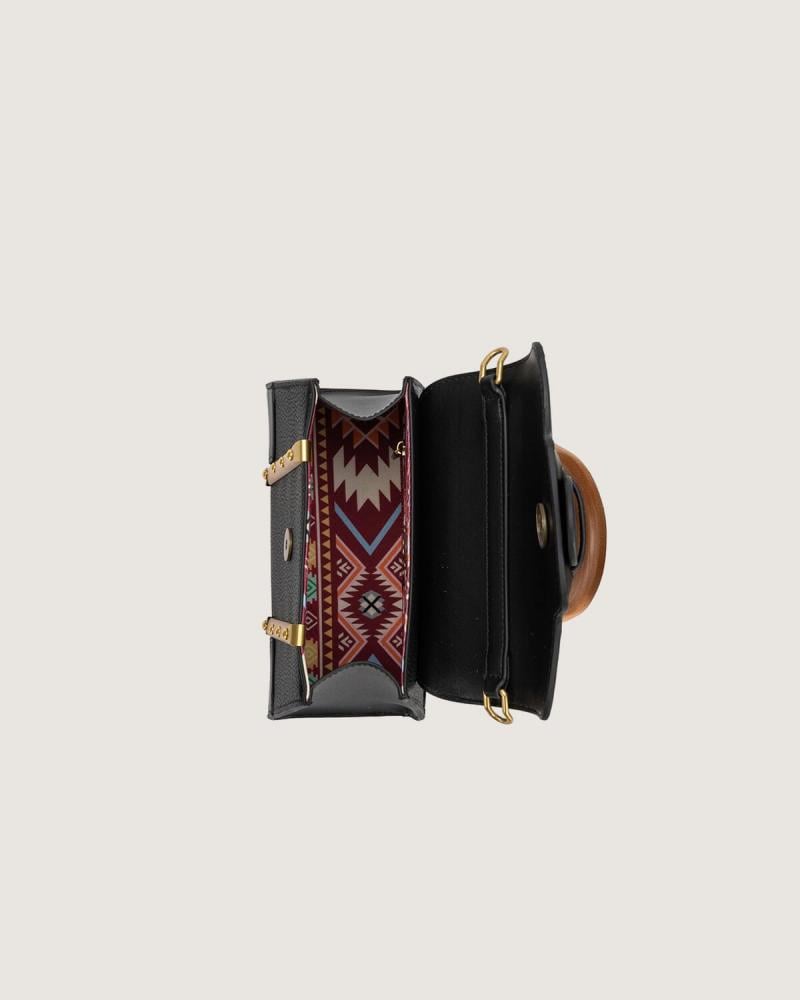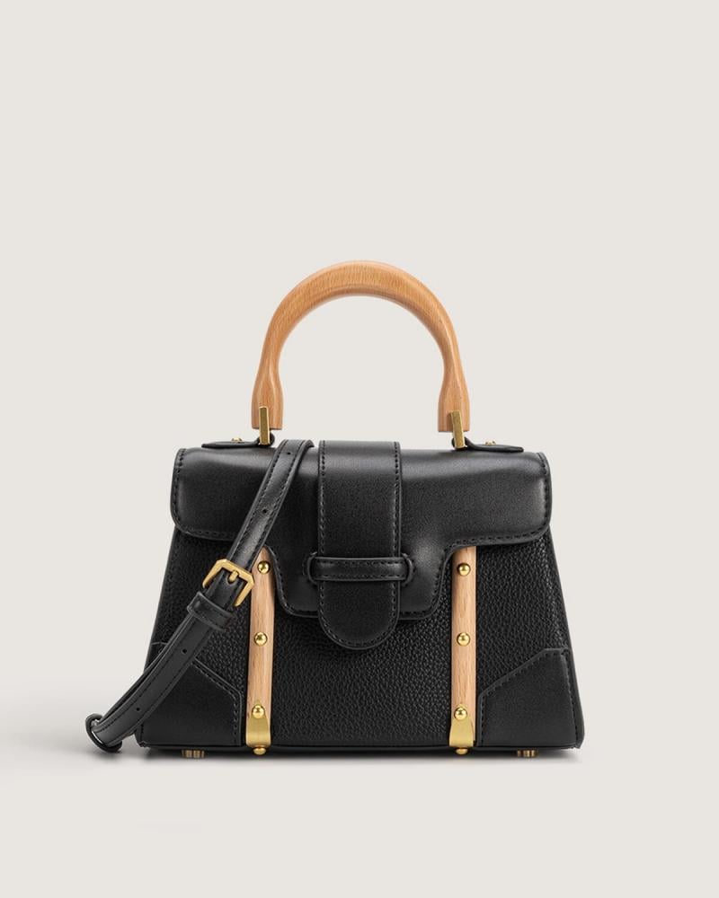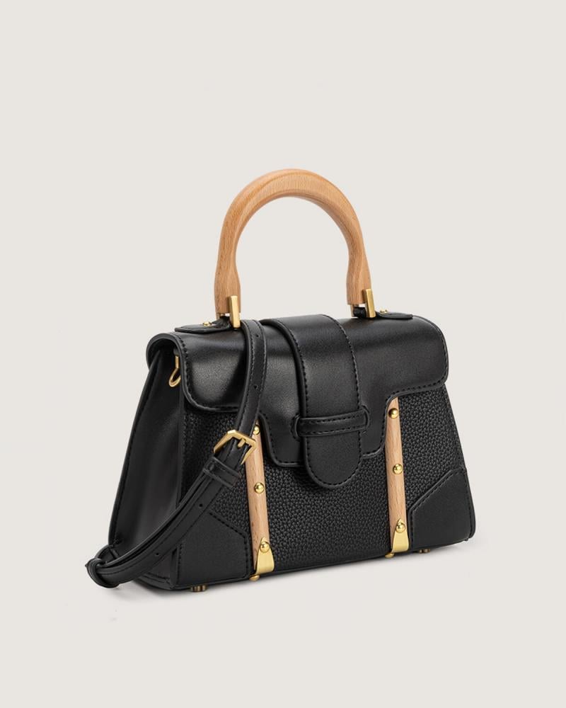 - شنطة نسائية من الجلد باللون الأسود وبيد مقوسة من الخشب وغطاء قلاب
