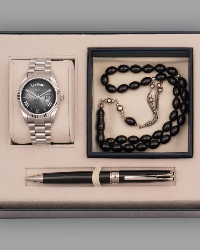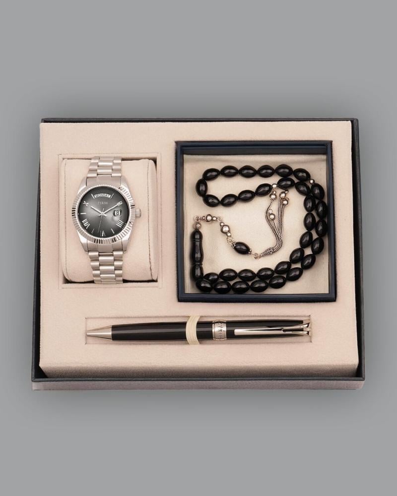 هدية راقية: ساعة أنيقة تنبض بالرقي، يكتمل بها سبحة وقلم لتصف معاني الأناقة. مزيج ساحر يجمع بين الدقة والذوق الرفيع، ليكون عنوانًا للتألق في كل مناسبة