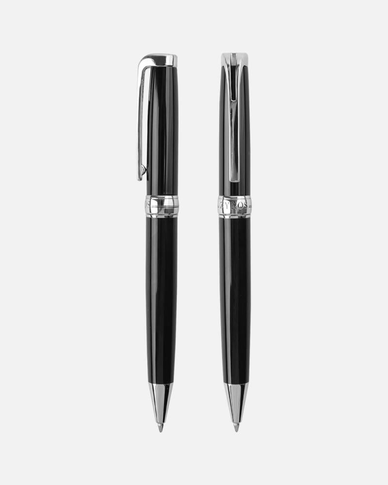 - القلم: قلم رجالي من المعدن باللون الأسود والفضي بحبر جاف بلون أزرق يتميز بطريقة قفل انسيابية تضمن عدم تسرب الحبر