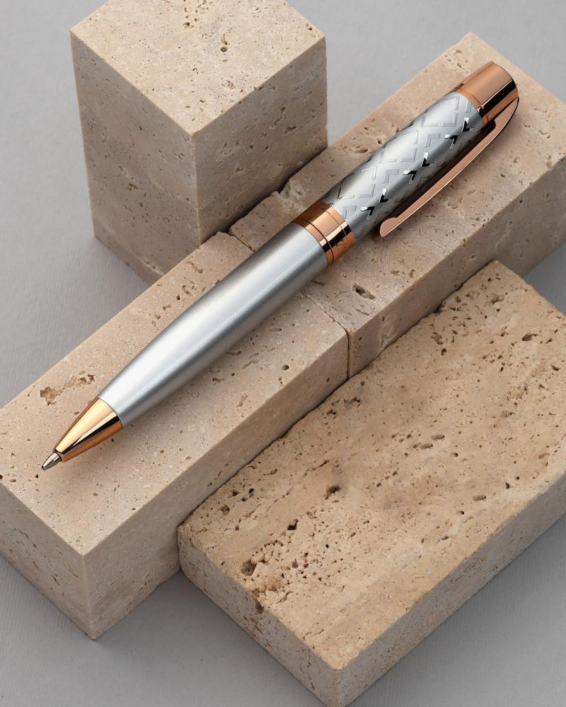 - القلم: قلم رجالي من المعدن باللون الذهبي والفضي بحبر جاف بلون أزرق يتميز بطريقة قفل انسيابية تضمن عدم تسرب الحبر