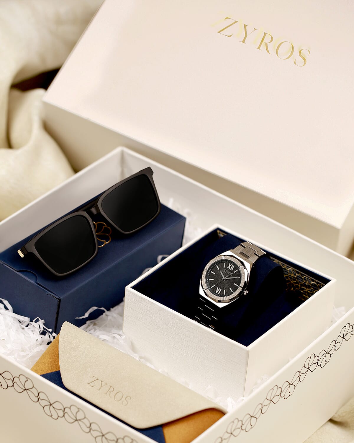 - هدية رجالية بتصميم مميز تتكون من ساعة و نظارة شمسية و حافظة للنظارة