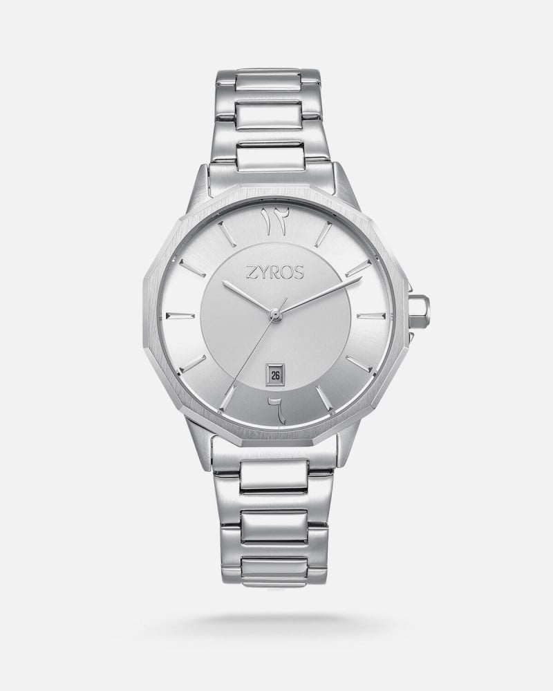 ساعة رجاليه من ماركة زايروس بسوار من الستانلس ستيل باللون الفضي ، ساعة تتميز بلمسه من الفخامه بطابع كلاسيك، تتميز الساعه بميناء أنيق باللون الفضي وبأرقام عربيه لتعزز الأصاله والرقي في إطلالتك، ميناء بإطار هندسي بارز ،هذه الساعة الخيار الأمثل لطله عمليه مفعمه بالحيويه في كل اوقاتك من اليوم ، تناسب الساعه طله نهاريه ليوم جامعي او لعمل مكتبي ، وايضا تناسب الساعة إطلاله مسائيه لتضيف المزيد من الأناقه لك .