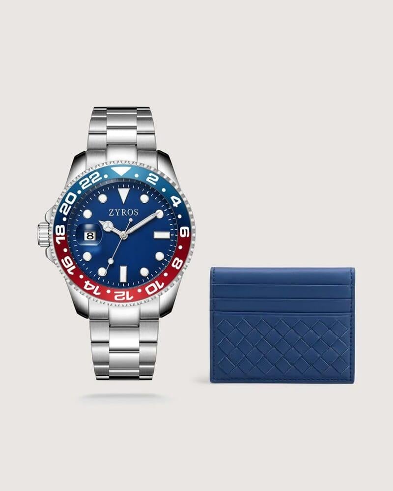 - وصف المحفظة : محفظة من الجلد باللون الأزرق بتصميم عملي يتسع لبطاقاتك ونقودك، وتتميز بتصميم الجلد المتداخل .