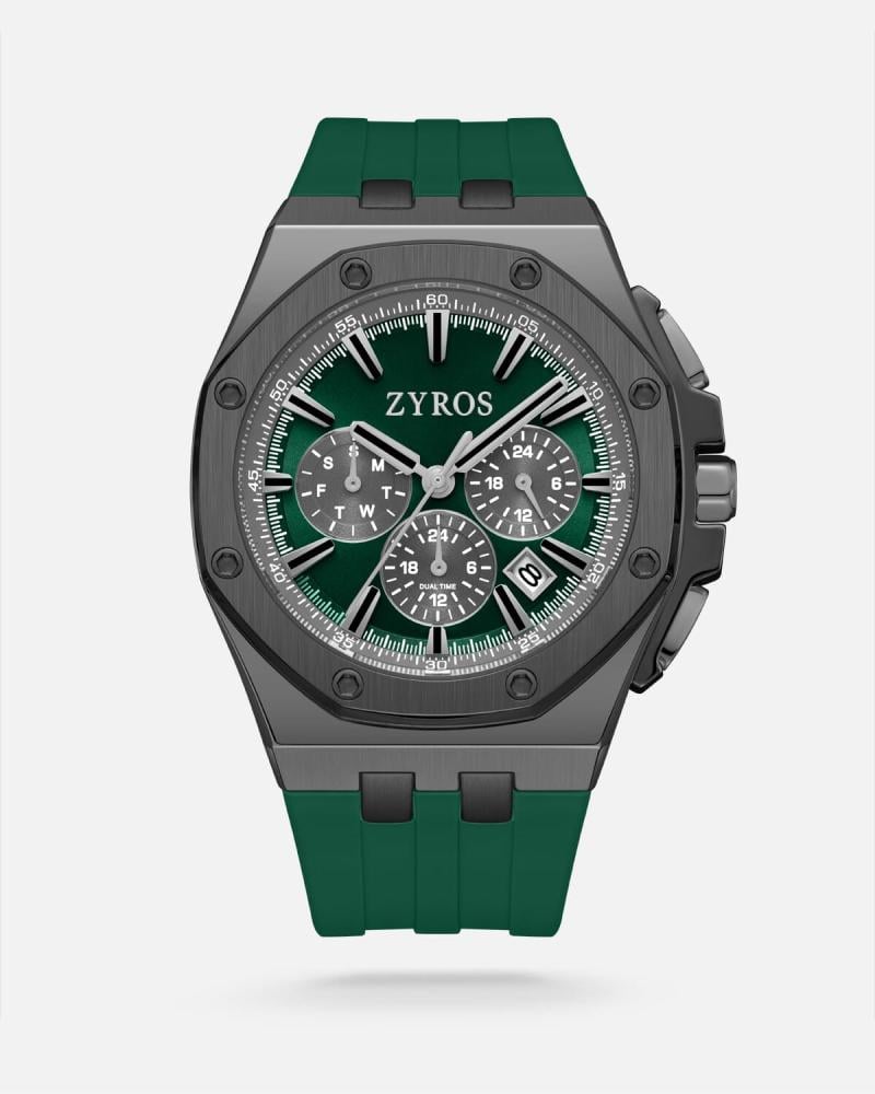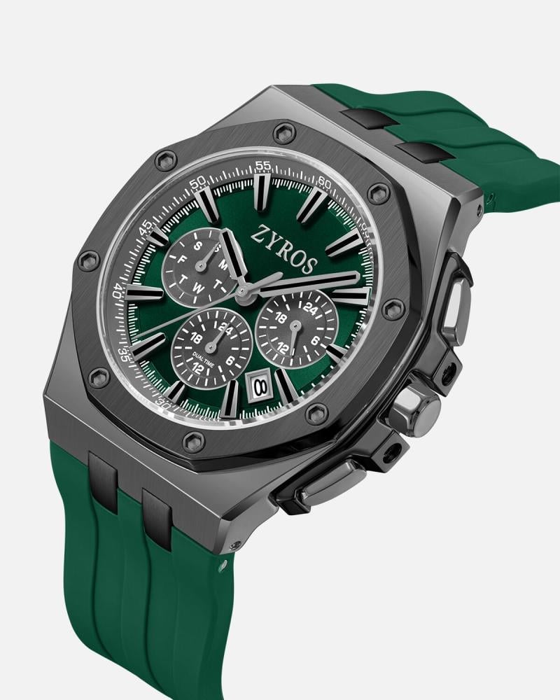 أناقة رياضية لا تعرف الحدود. هيكل قوي، يحتضن ميناءً داكنًا بتفاصيل دقيقة، يكشف عن نبض الوقت بوضوح. سوار من الربل المرن، يمنحك راحة لا مثيل لها، وجاهزية لأي مغامرة. عدادات فرعية دقيقة، وعقارب مضيئة، تجعلها رفيقك المثالي في كل لحظة. "تجمع بين الأناقة والعملية، لتكون إضافة مميزة إلى إطلالتك."